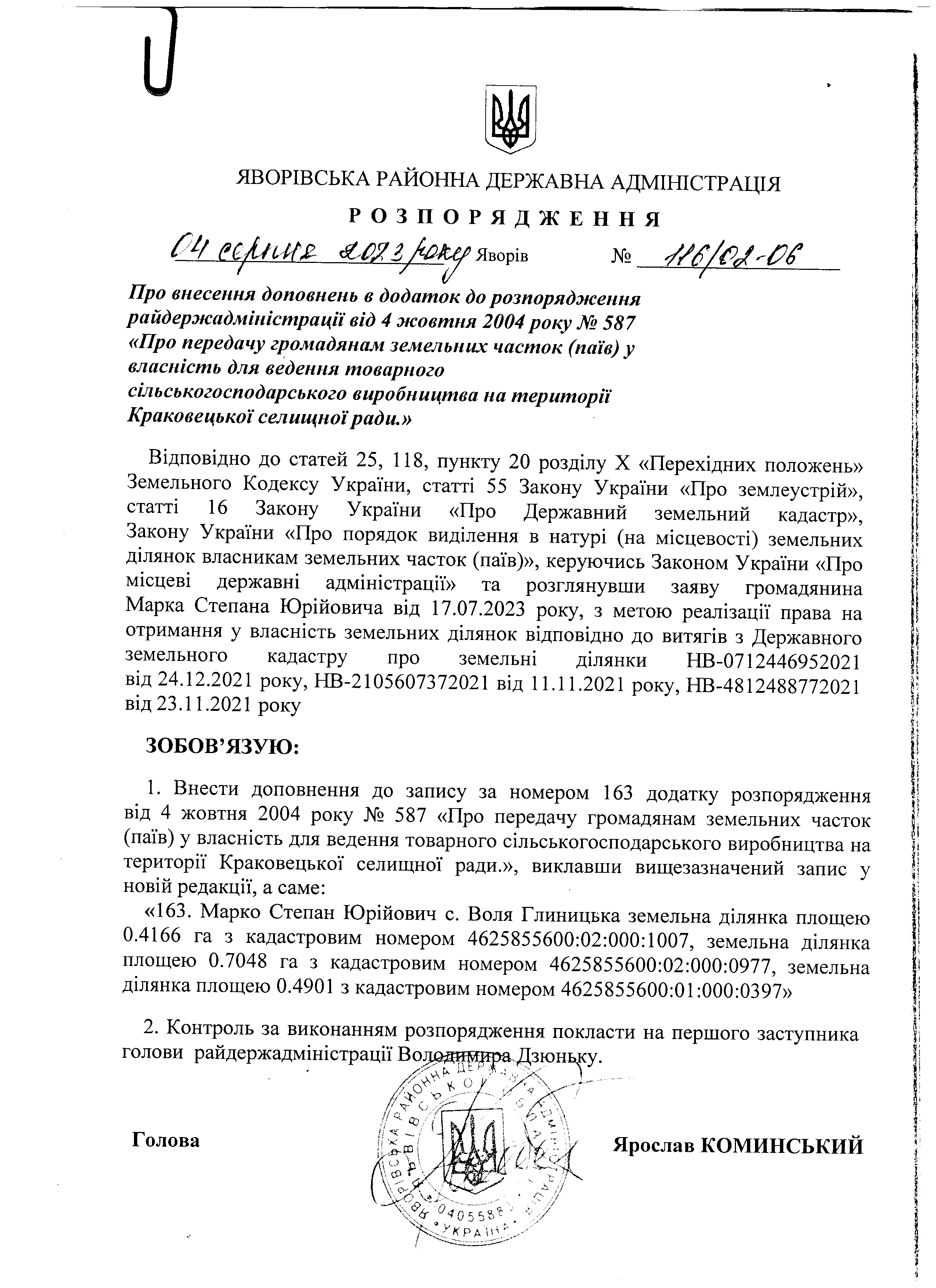 116/02-06 2023-08-04 Про внесення доповнень в додаток до розпорядження райдержадміністрації від 4 жовтня 2004 року №587 "Про передачу громадянам земельних часток (паїв) у власність для ведення товарного сільськогосподарського виробництва на території Краковецької селищної ради