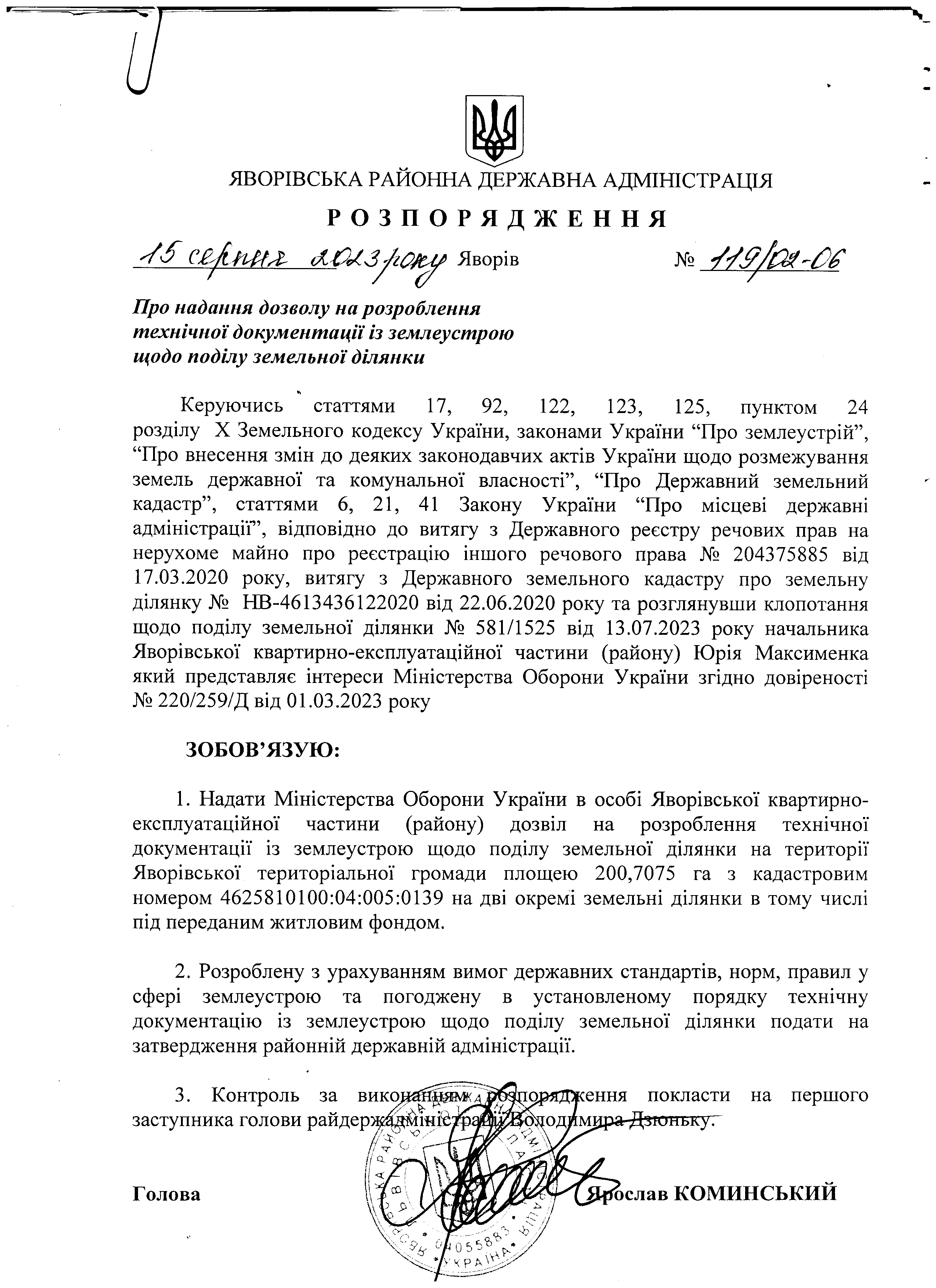 119/02-06 2023-08-15 Про надання дозволу на розроблення технічної документації із землеустрою щодо поділу земельної ділянки