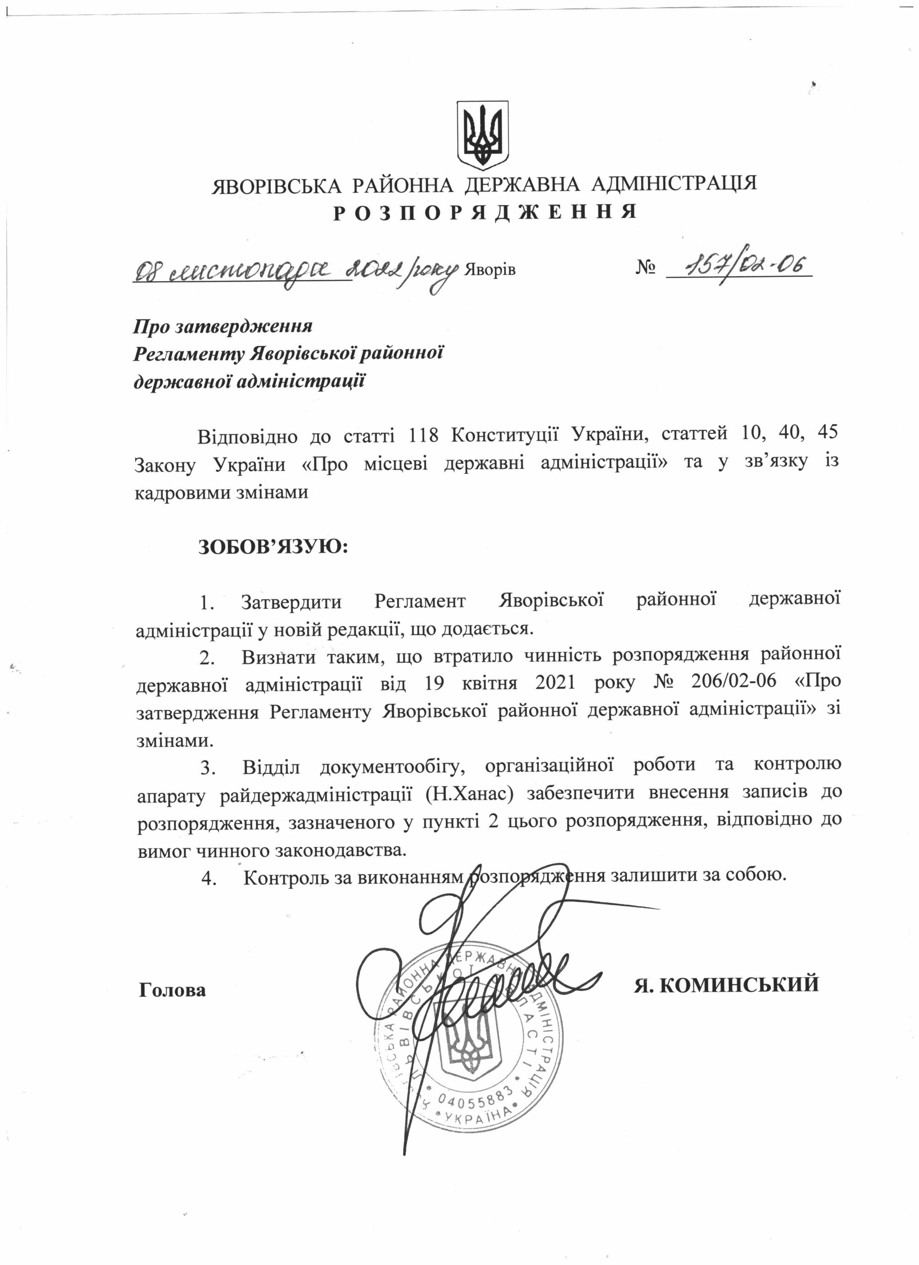 Про затвердження Регламенту Яворівської районної державної адміністрації |