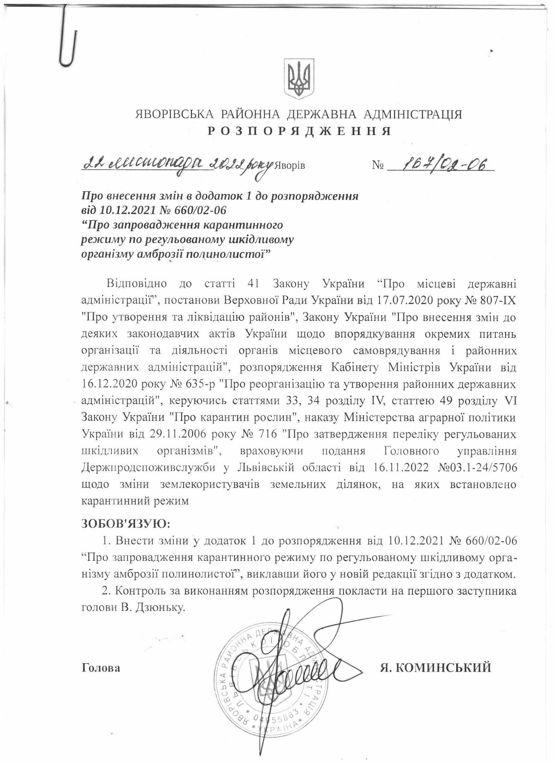 Про внесення змін в додаток 1 до розпорядження від 10.12.2022 №660/02-06 "Про запровадження карантинного режиму по регульованому шкідливому організму амброзії полинолистої" |