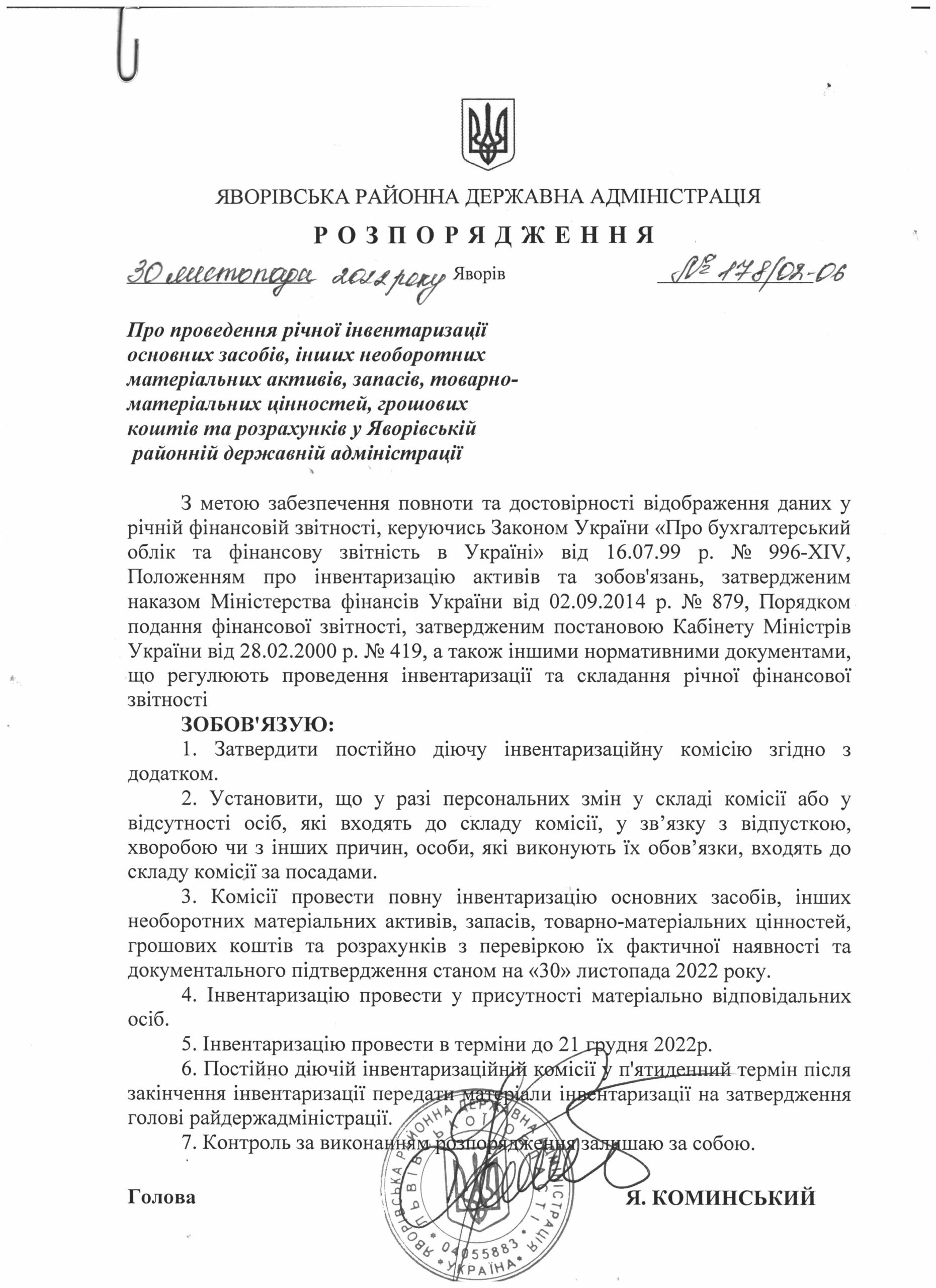 Про проведення річної інвентаризації основних засобів, інших необоротних матеріальних активів, запасів, товарно-матеріальних цінностей, грошових коштів та розрахунків у Яворівській районній державній адміністрації |