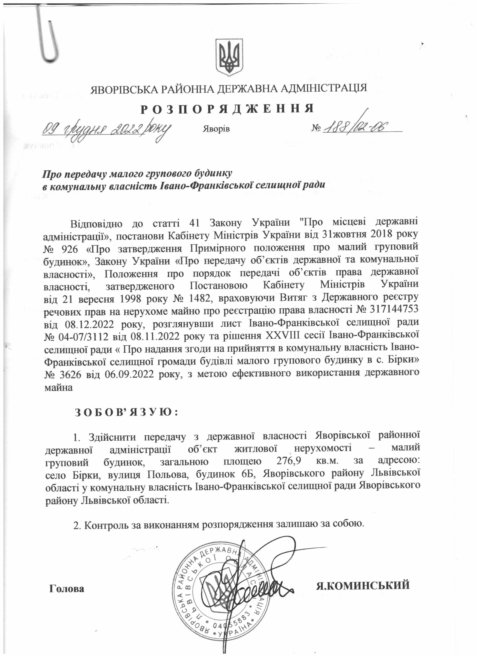 Про передачу малого групового будинку в комунальну власність Івано-Франківської селищної ради |