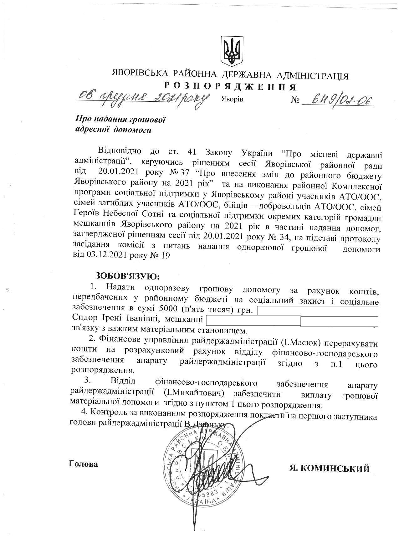 677/02-06 2021-12-21 Про надання грошової адресної допомоги