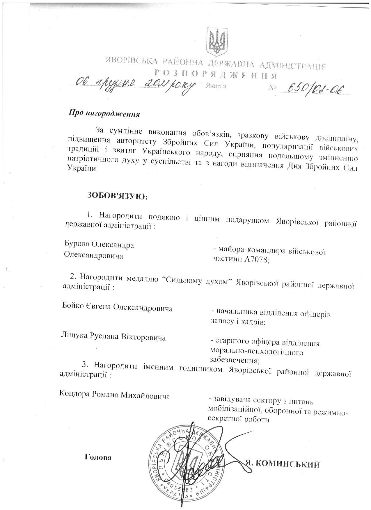 Про порядок організації і проведення в Яворівському районі заходів з підготовки громадян України до національного спротиву на 2026 рікПро внесення змін до розпорядження Яворівської районної військової адміністрації від 22.12.2025 року №73/02-06ВА ”Про районний бюджет Яворівського району на 2026 рік”Про затвердження Плану заходів із запобігання та виявлення корупції у Яворівській районній державній адміністрації на 2026 рікПро внесення змін до розпорядження районної військової адміністрації від 05 січня 2026 року Nº 1/02-06 ВА “Про стан військового обліку на території Яворівського району у 2025 році та завдання на 2026 рік та проведення перевірки технічного стану транспортних засобів на підприємствах, установах, організаціях та їх готовності до передачі військовим формуванням на період мобілізації та на воєнний час “Про нагородження(не підлягає оприлюдненню)Про розподіл асигнувань загального фонду державного бюджету на 2026 рікПро нагородженняПро стан війського обліку на території Яворівського району у 2025 році та завдання на 2026 рік та проведення перевірки технічного стану транспортних засобів на підприємтсвах, установах, організаціях та їх готовності до передачі військовим формуванням на період мобілізації та на воєнний станДСК (не підлягає оприлюдненню)Про затвердження планів роботи структурних підрозділів Яворівської районної державної адміністрації