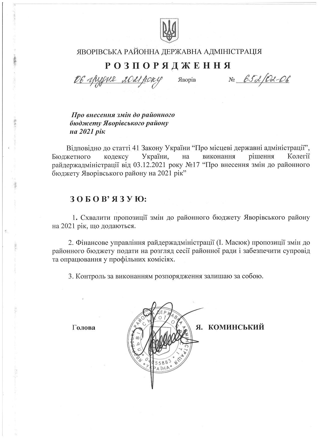 652/02-06 2021-12-06 Про внесення змін до районного бюджету Яворівського району на 2021 рік