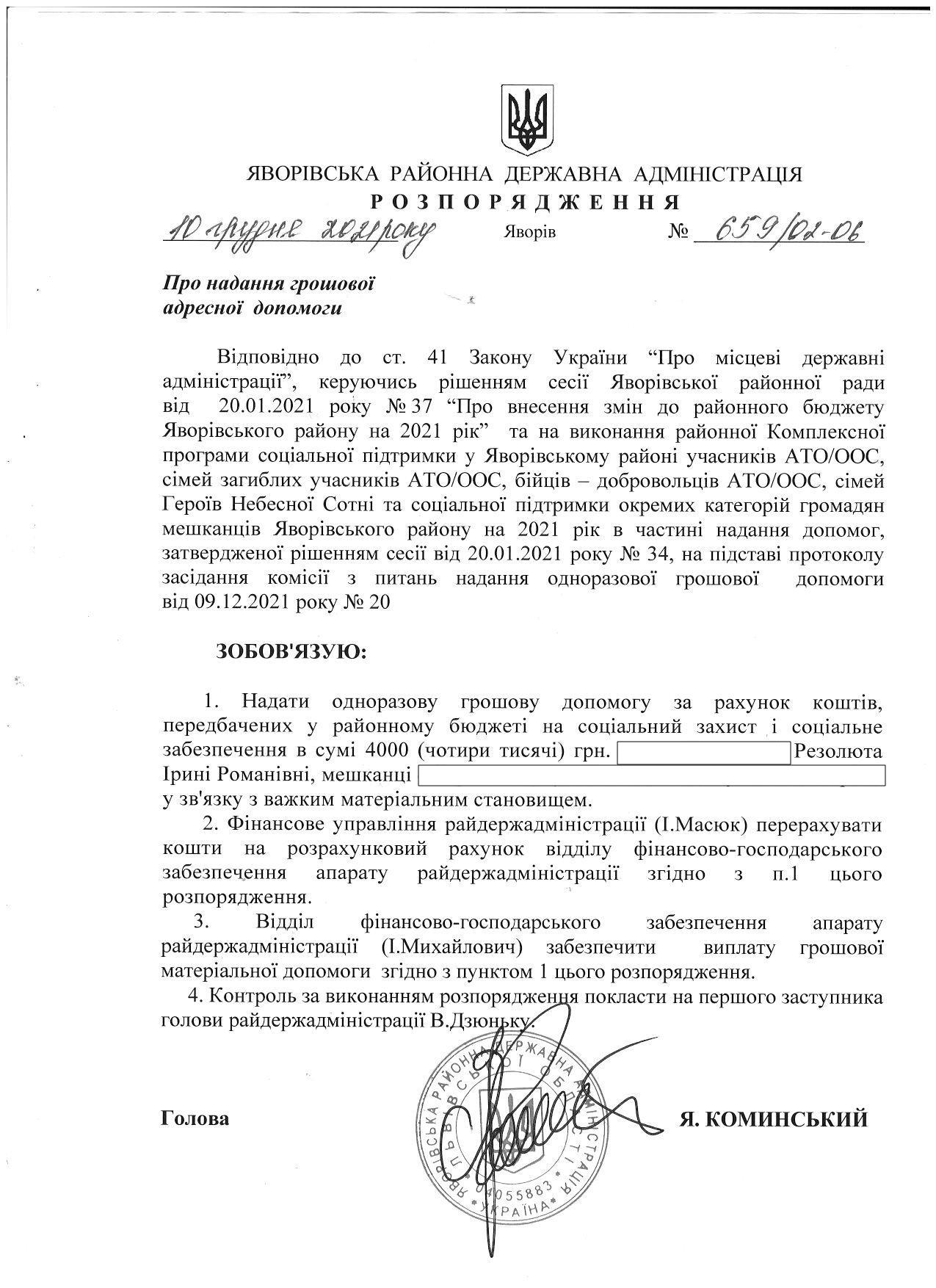 659/02-06 2021-12-10 Про надання грошової адресної допомоги