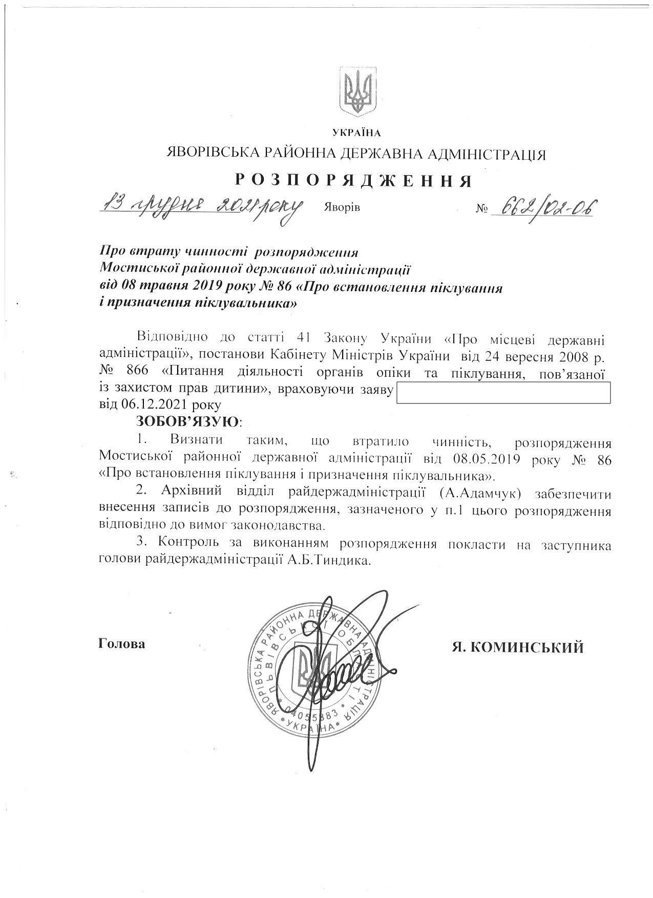 662/02-06 2021-12-13 Про втрату чинності розпорядження Мостиської районної державної адміністрації від 08 травня 2019 року №86 "Про встановлення піклування і призначення піклувальника"