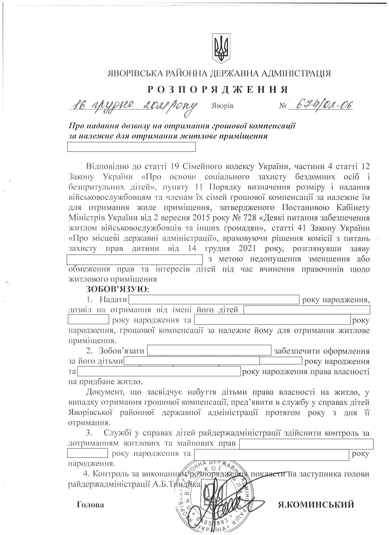 674/02-06 2021-12-16 Про надання дозволу на отримання грошової компенсації за належне для отримання житлове приміщення