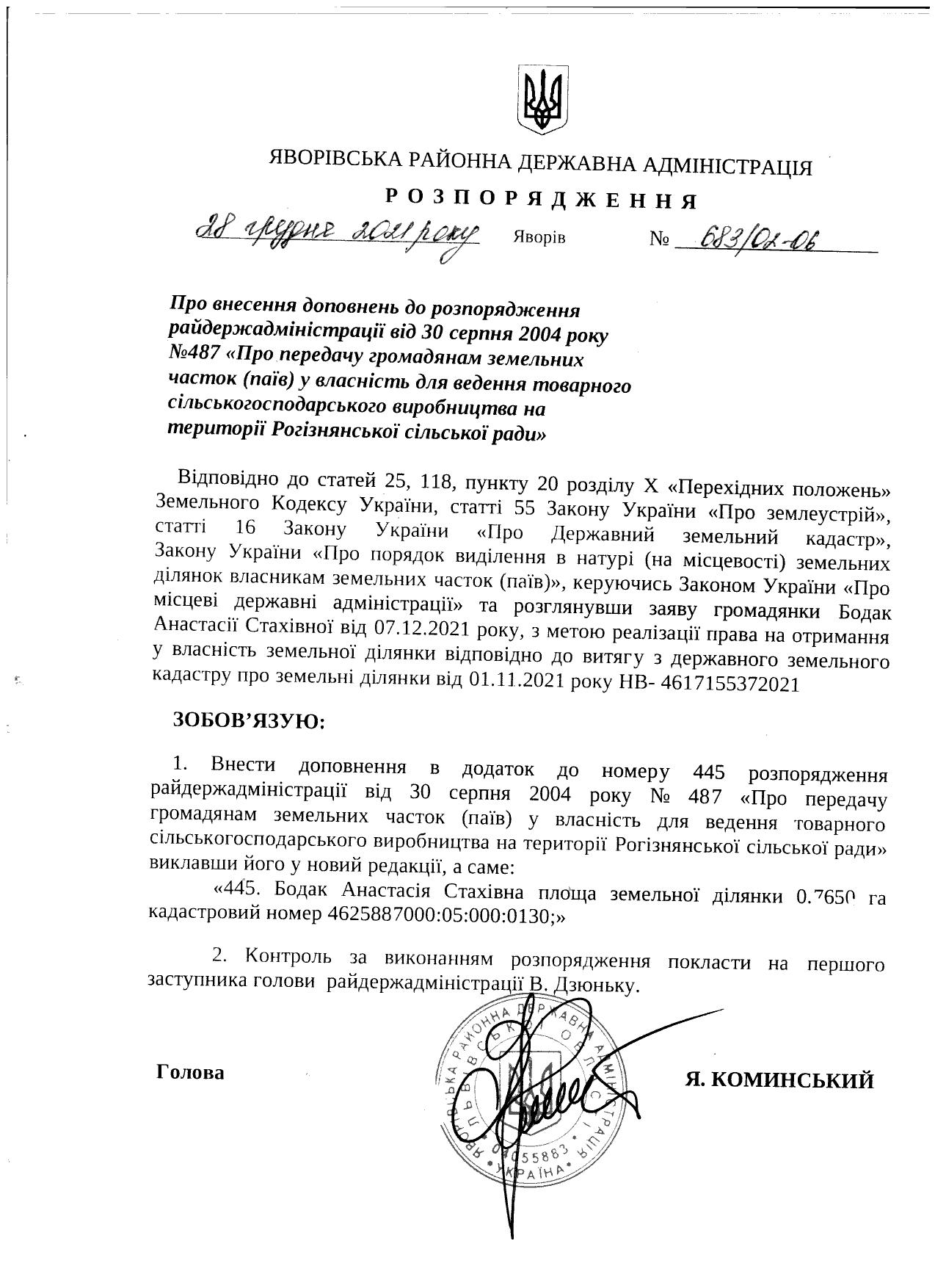 683/02-06 2021-12-28 Про внесення доповнень до розпорядження райдержадміністрації від 30 серпня 2004 року №487 "Про передачу громадянам земельних часток (паїв) у власність для ведення товарного сільськогосподарського виробництва на території Рогізнянської сільської ради"