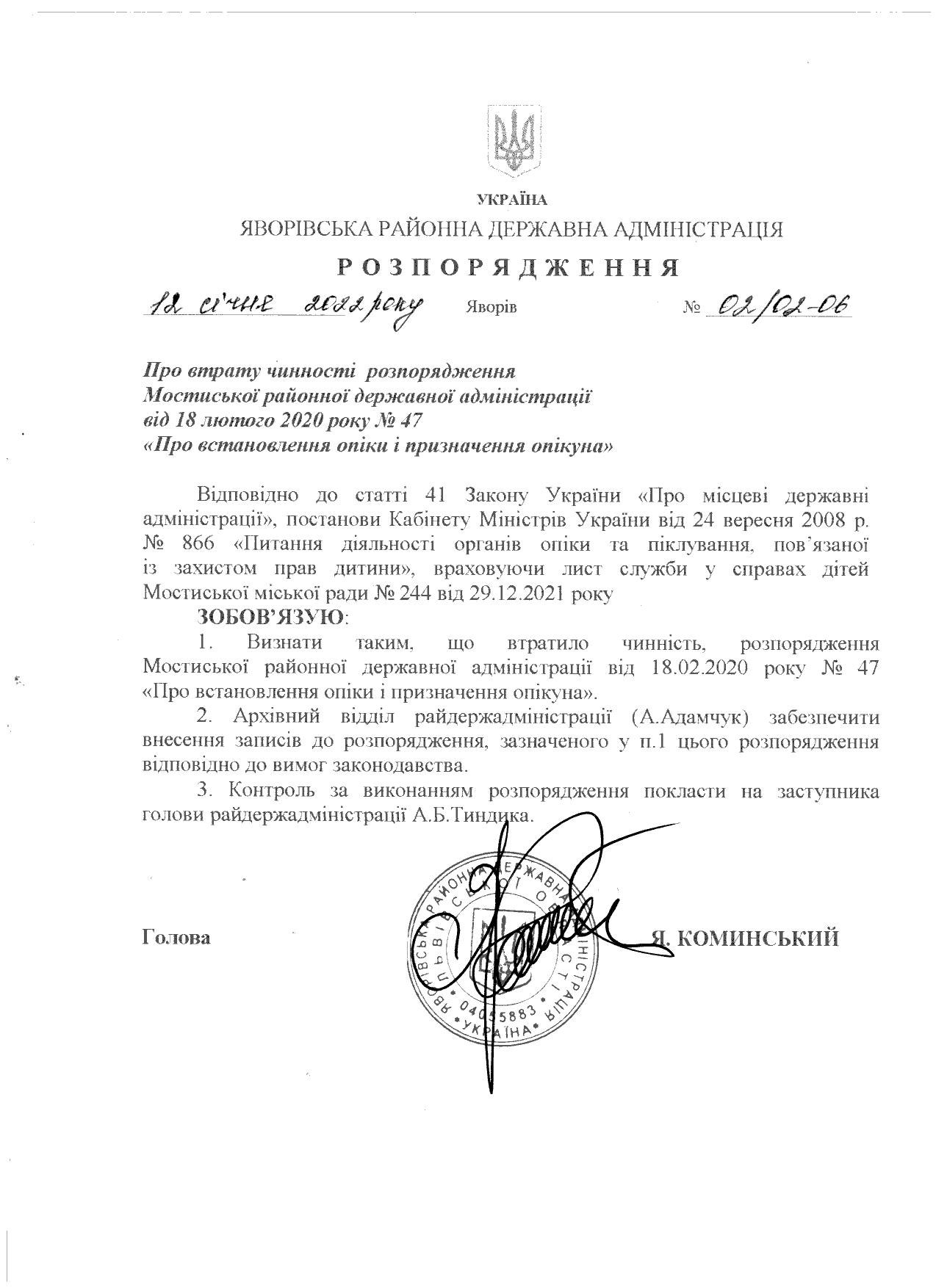 02/02-06 2022-01-12 Про втрату чинності розпорядження Мостиської районної державної адміністрації від 18 лютого 2020 року №47 "Про встановлення опіки і призначення опікуна"