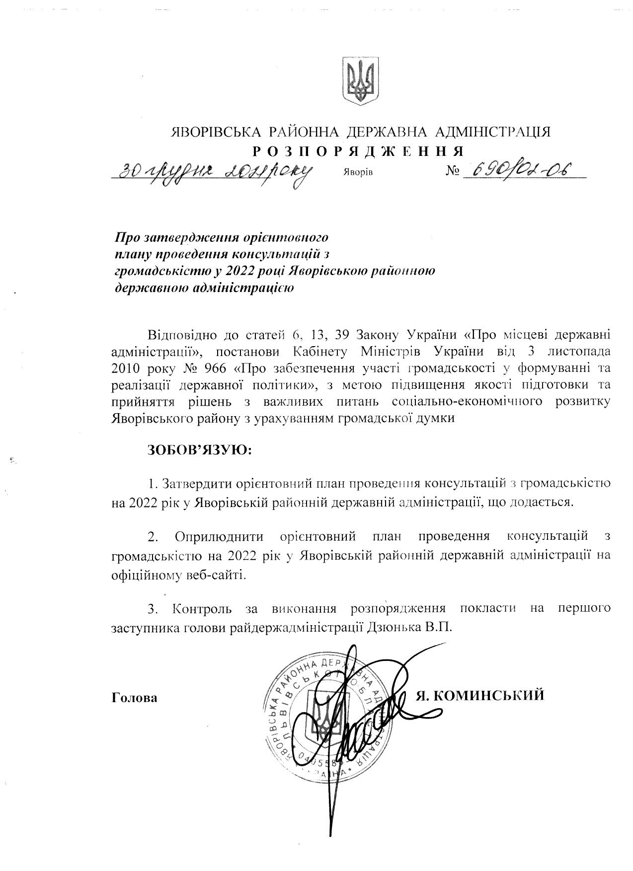 690/02-06 2021-12-30 Про затвердження орієнтовного плану консультацій з громадськістю у 2022 році Яворівською районною державною адміністрацією