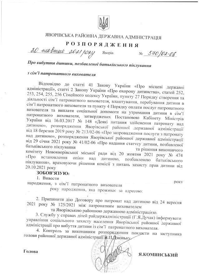 570/02-06 2021-10-20 Про вибуття дитини, позбавленої батьківського піклування з сім'ї патронатного виховання