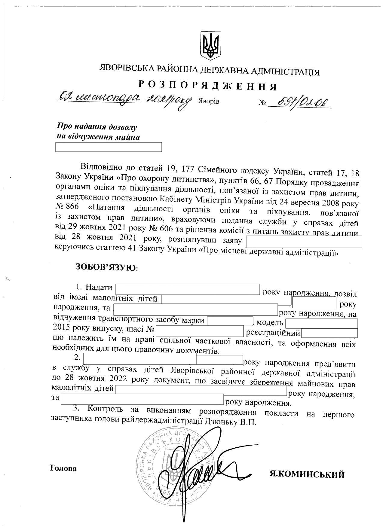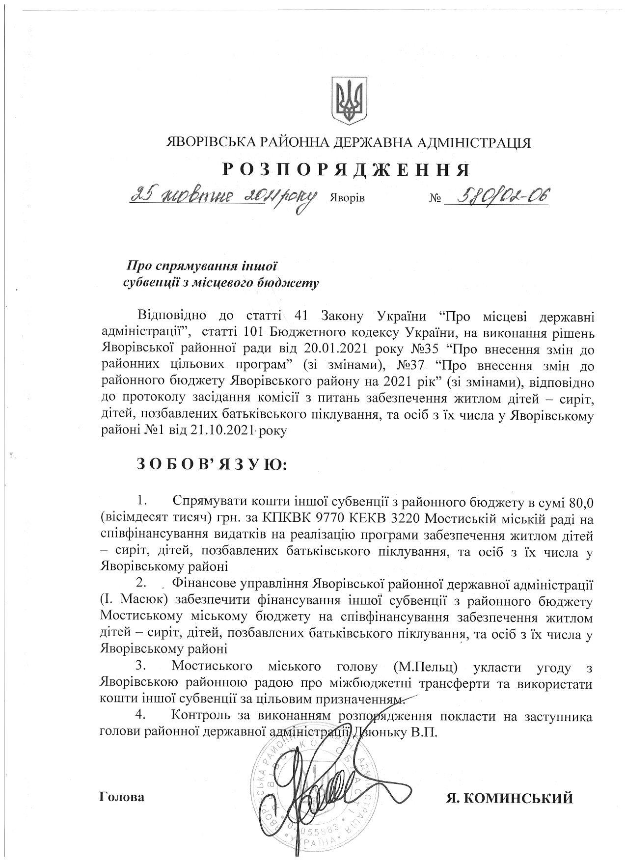595/02-06 2021-11-03 Про надання права підпису у Яворівській районній державній адміністрації