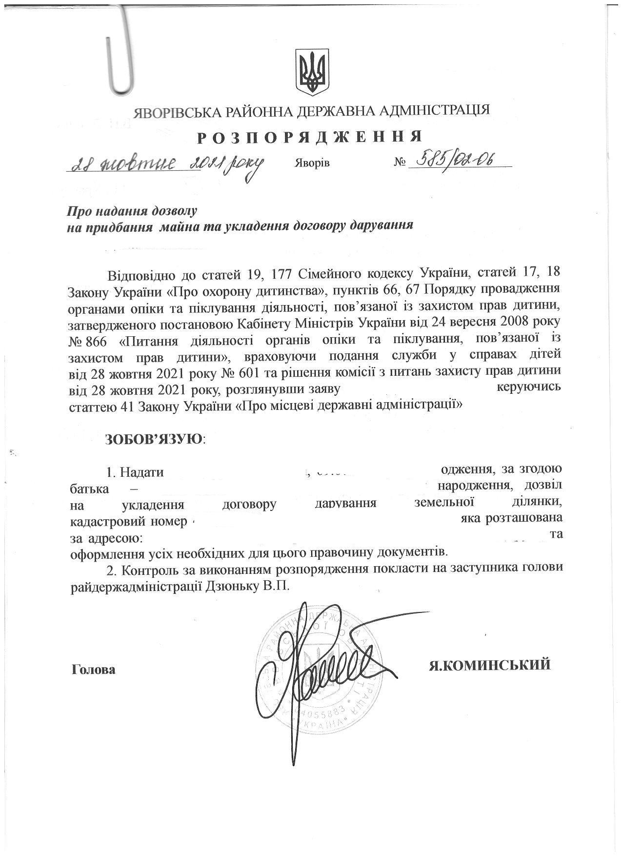 585/02-06 2021-10-28 Про надання дозволу на придбання майна та укладення договору дарування