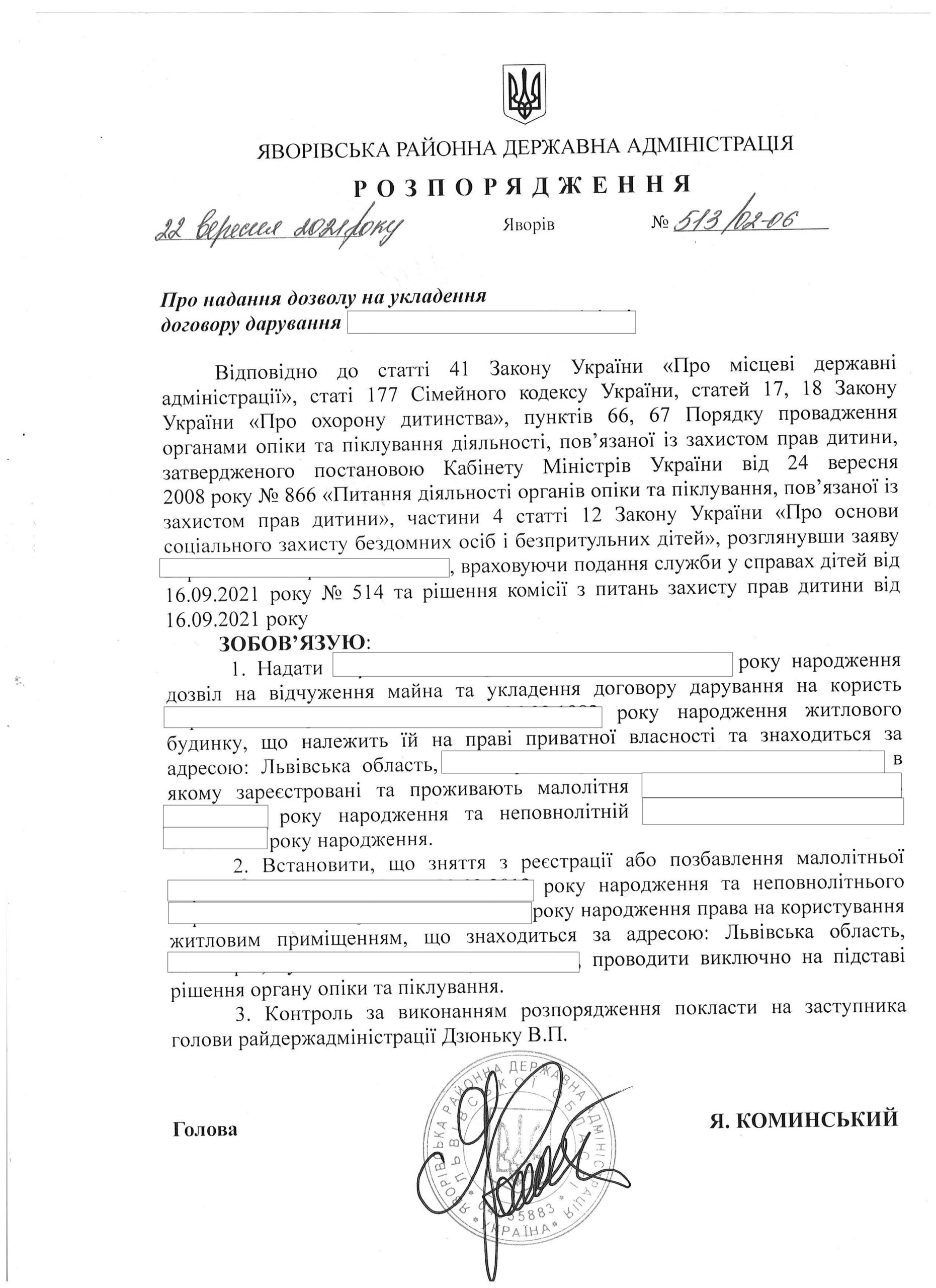 513/02-06 2021-09-22 Про надання дозволу на укладення договору дарування