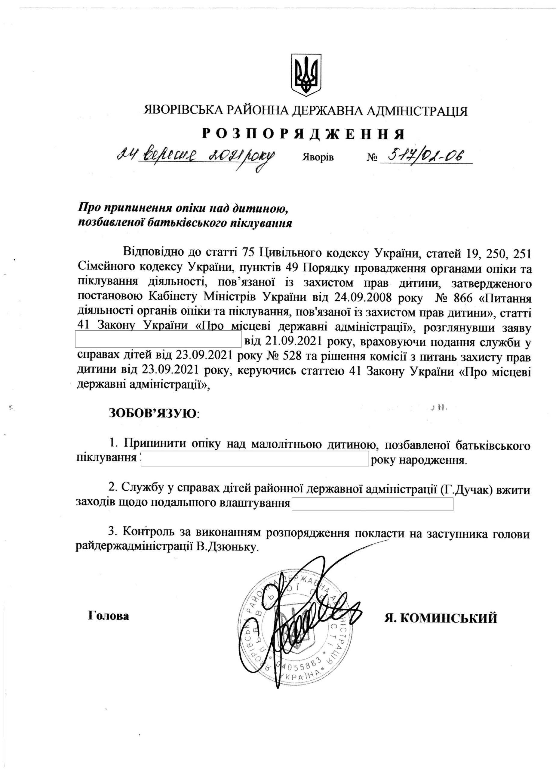517/02-06 2021-09-24 Про припинення опіки над дитиною, позбавленої батьківського піклування