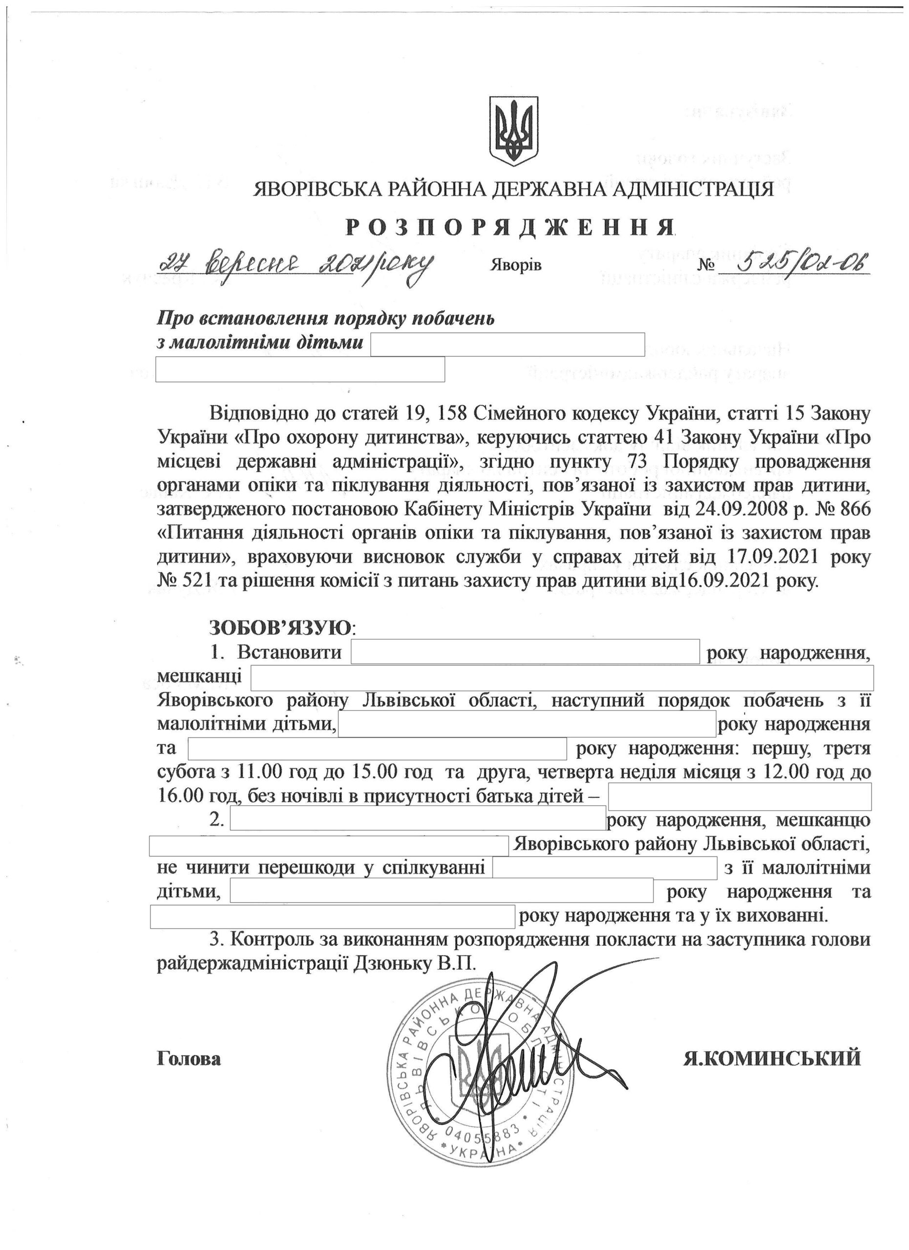 525/02-06 2021-09-27 Про встановлення порядку побачень з малолітніми дітьми