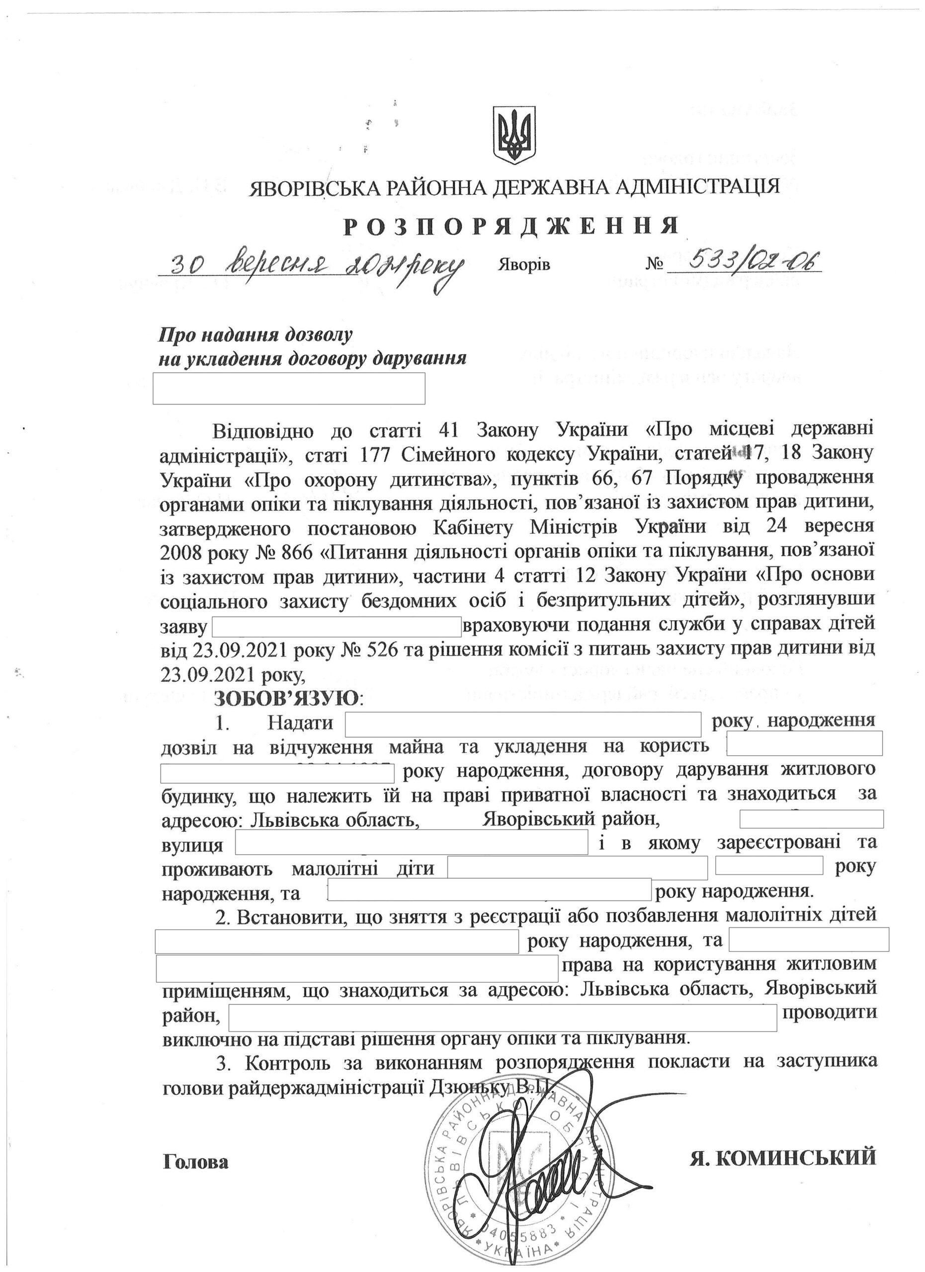 533/02-06 2021-09-30 Про надання дозволу на укладення договору дарування