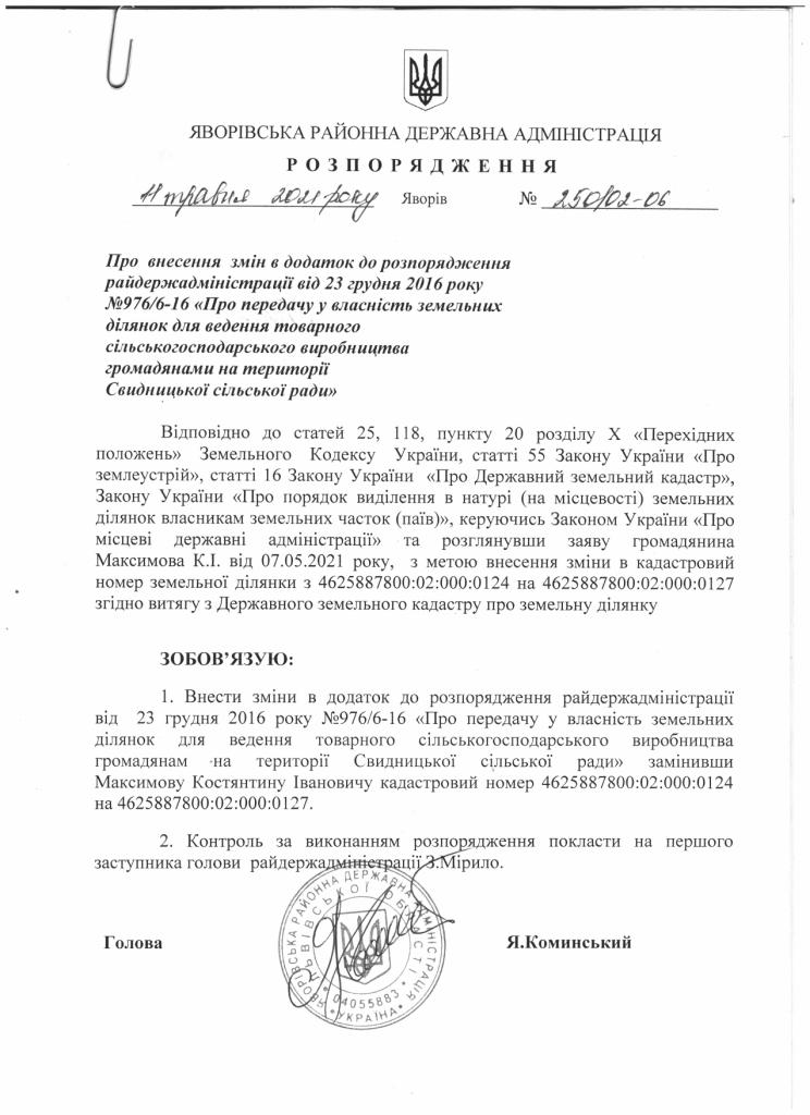 250/02-06 2021-05-11 Про внесення змін в додаток до розпорядження райдержадміністрації ві 23 грудня 2016 року № 976/6-16 "Про передачу у власність земельних ділянок для ведення товарного виробництва громадянами на території Свидницької сільської ради"
