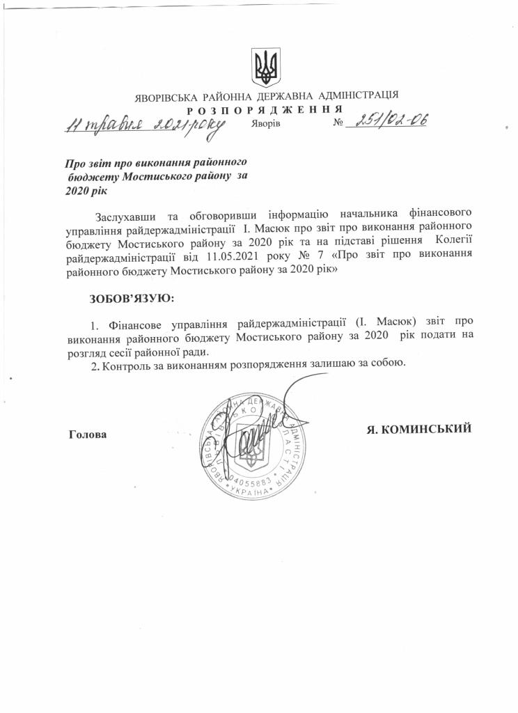 251/02-06 2021-05-11 Про звіт про виконанняирайонного бюджету Мостиського району за 2020 рік