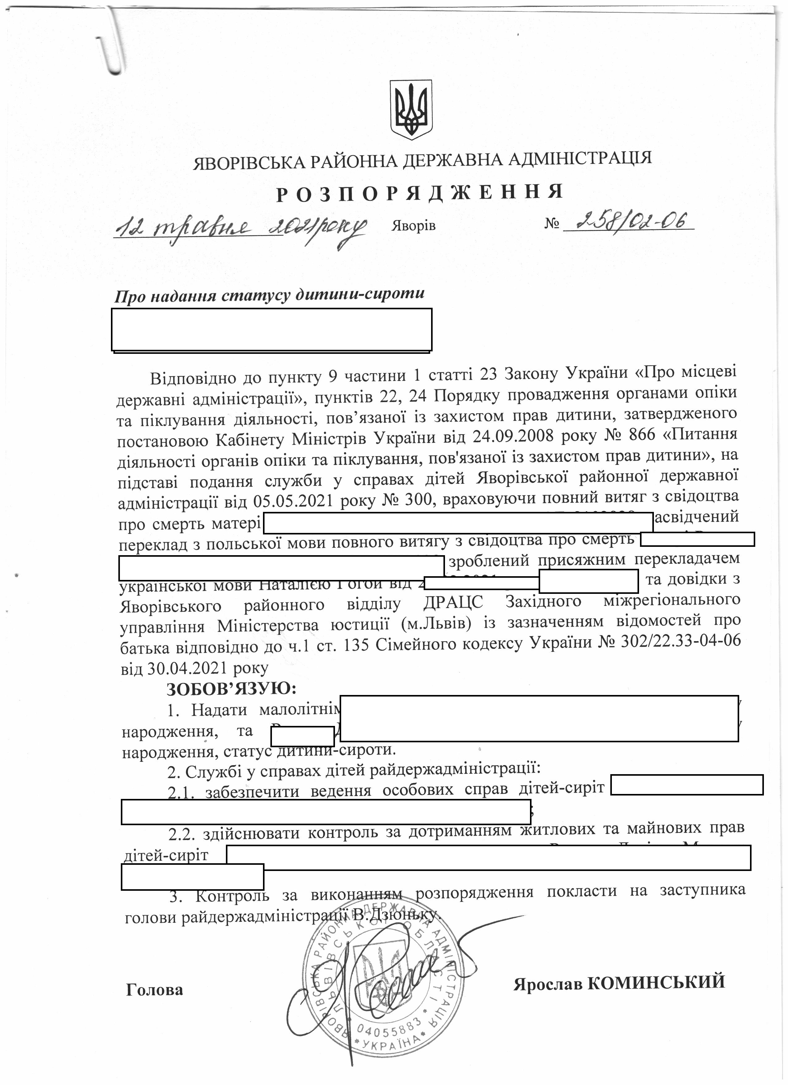 258/02-06 2021-05-12 Про надання статусу дитини-сироти