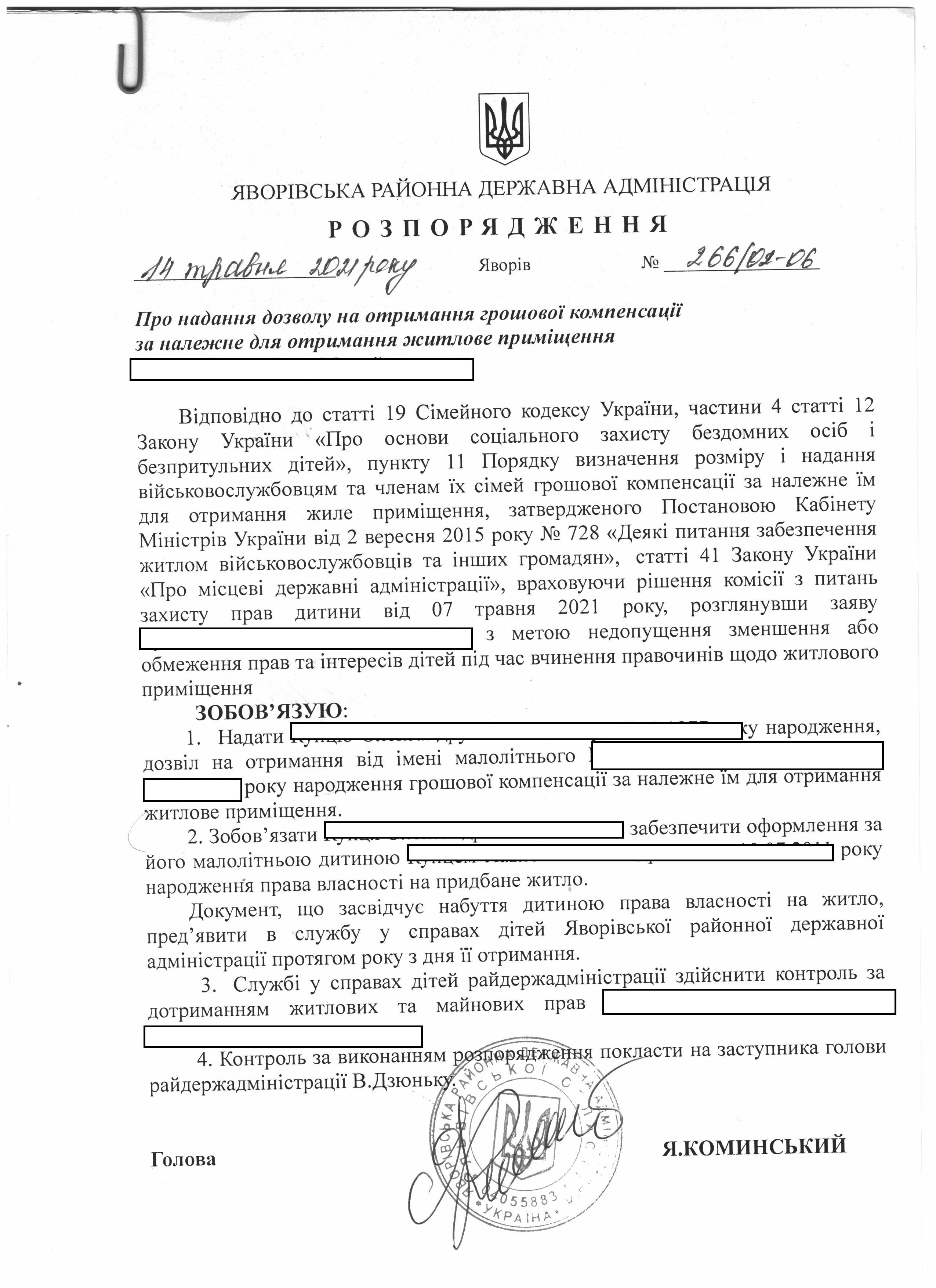 266/02-06 2021-05-14 Про надання дозволу на отримання грошової компенсвції за належне для отримання житлове приміщення
