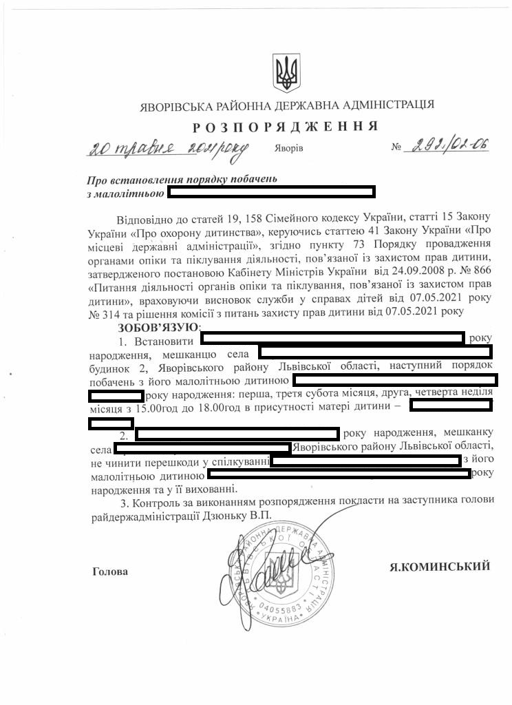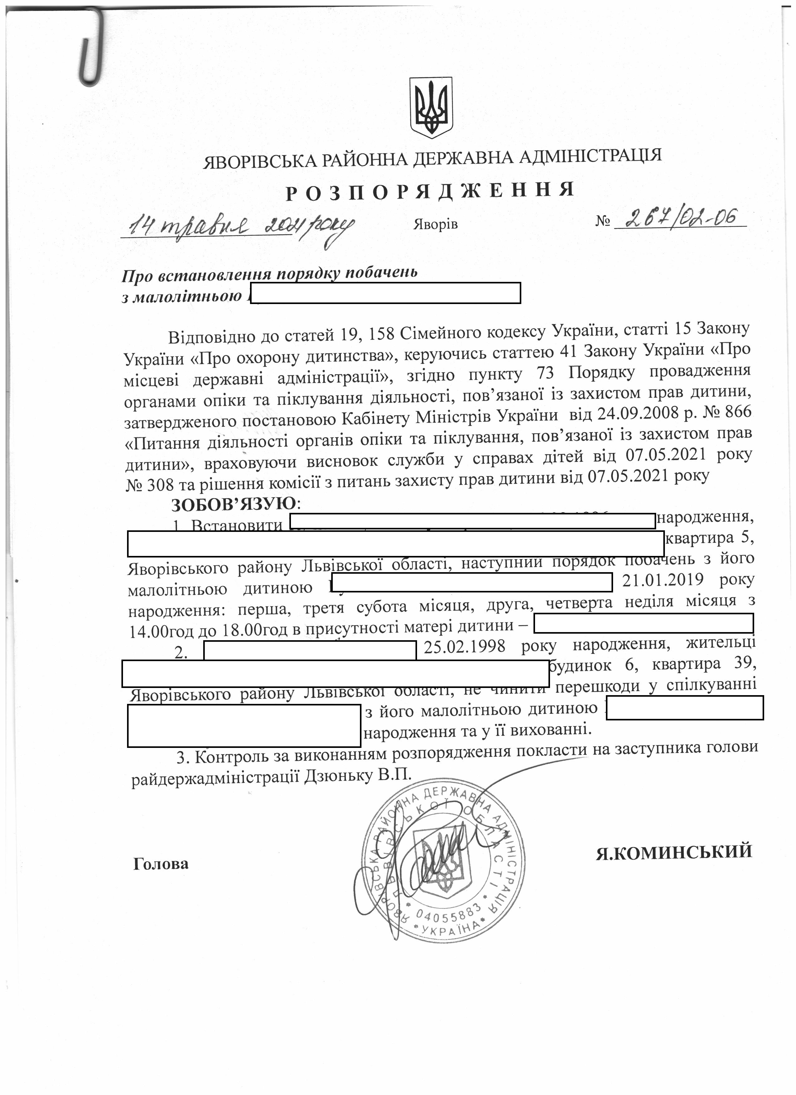 292/02-06 2021-05-20 Про встановлення порядку побачень з малолітньою дитиною
