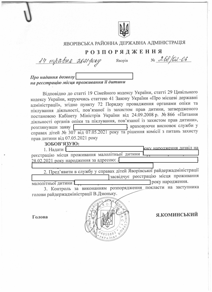268/02-06 2021-05-14 Про надання дозволу на реєстрацію місця проживання її дитини