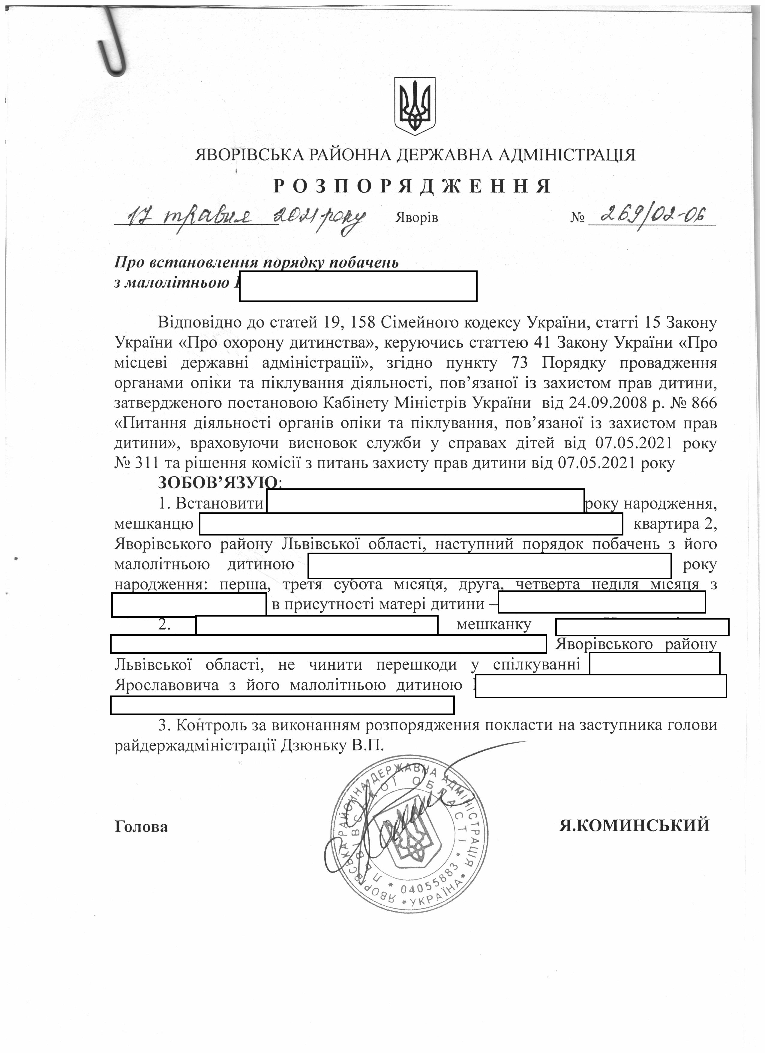 269/02-06 2021-05-17 Про встановлення порядку побачень з малолітньою