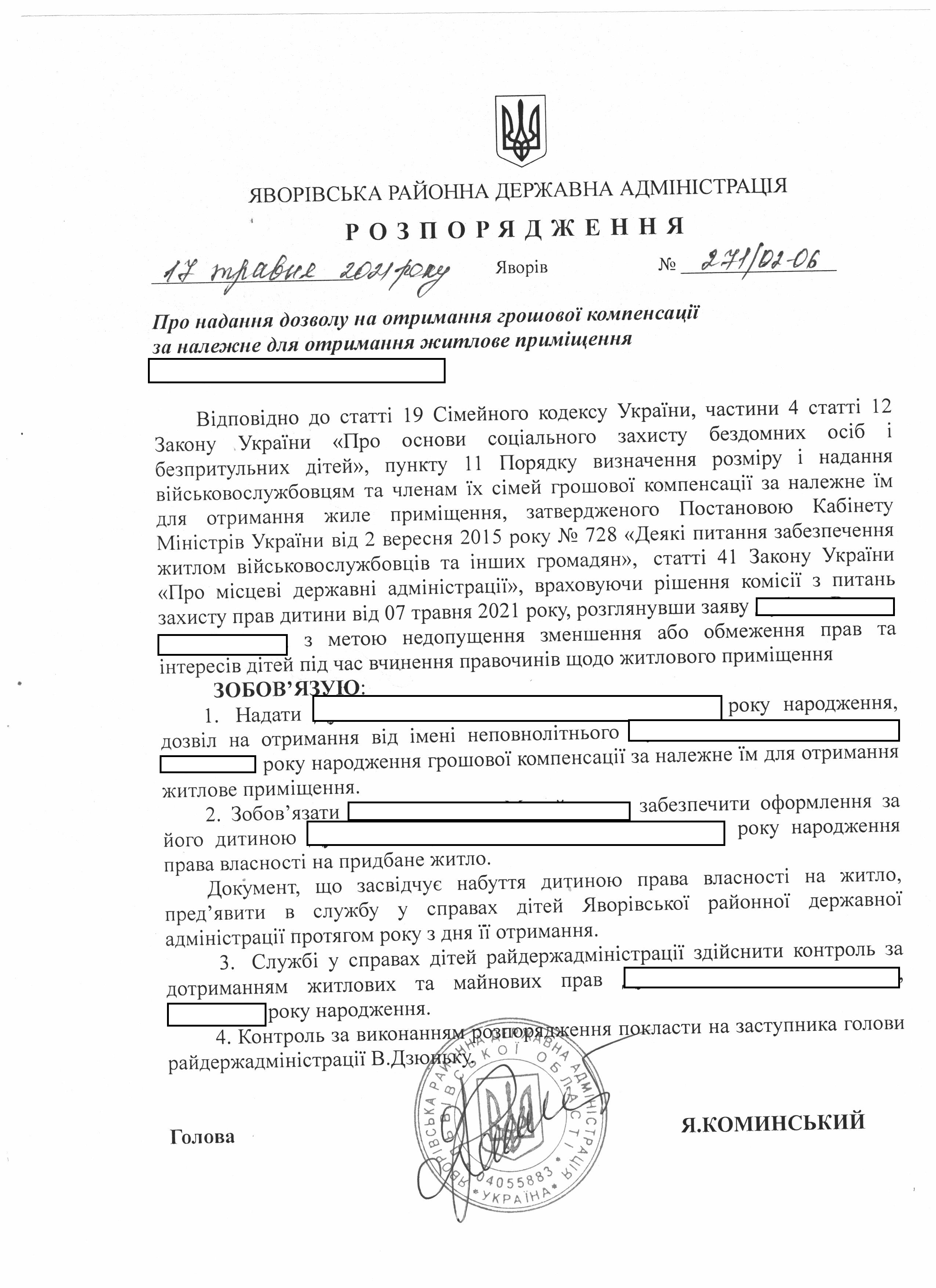 271/02-06 2021-05-17 Про надання дозволу на отримання грошової компенсації за належне для отримання житлове приміщення