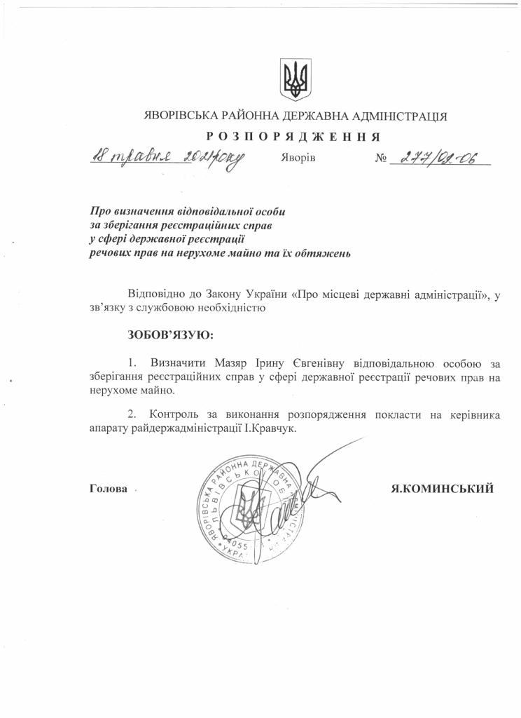 277/02-06 2021-05-18 Про визначення відповідальної особи за зберігання реєстраційних справ у сфері державної реєстрації речових прав на нерухоме майно та їх обтяжень