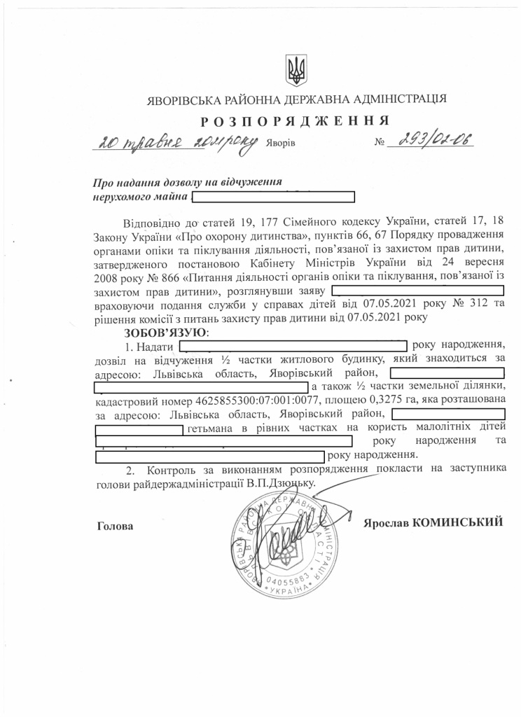 293/02-06 2021-05-20 Про надання дозволу на відчуження нерухомого майна