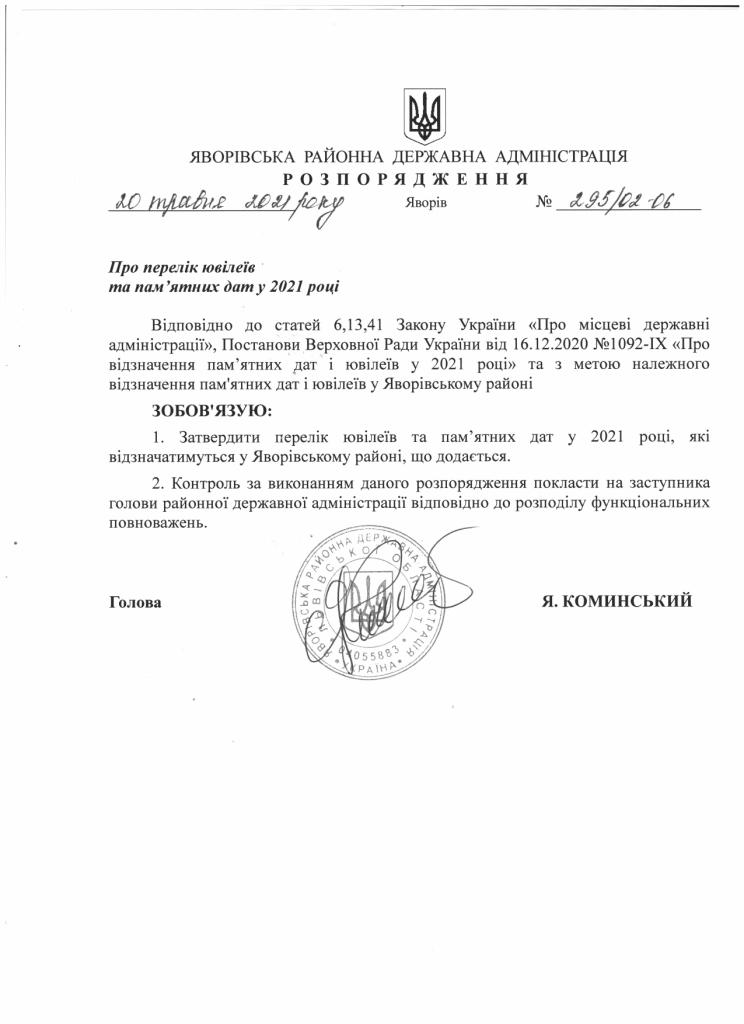 295/02-06 2021-05-20 Про перелік ювілеїв та пам'ятних дат у 2021 році