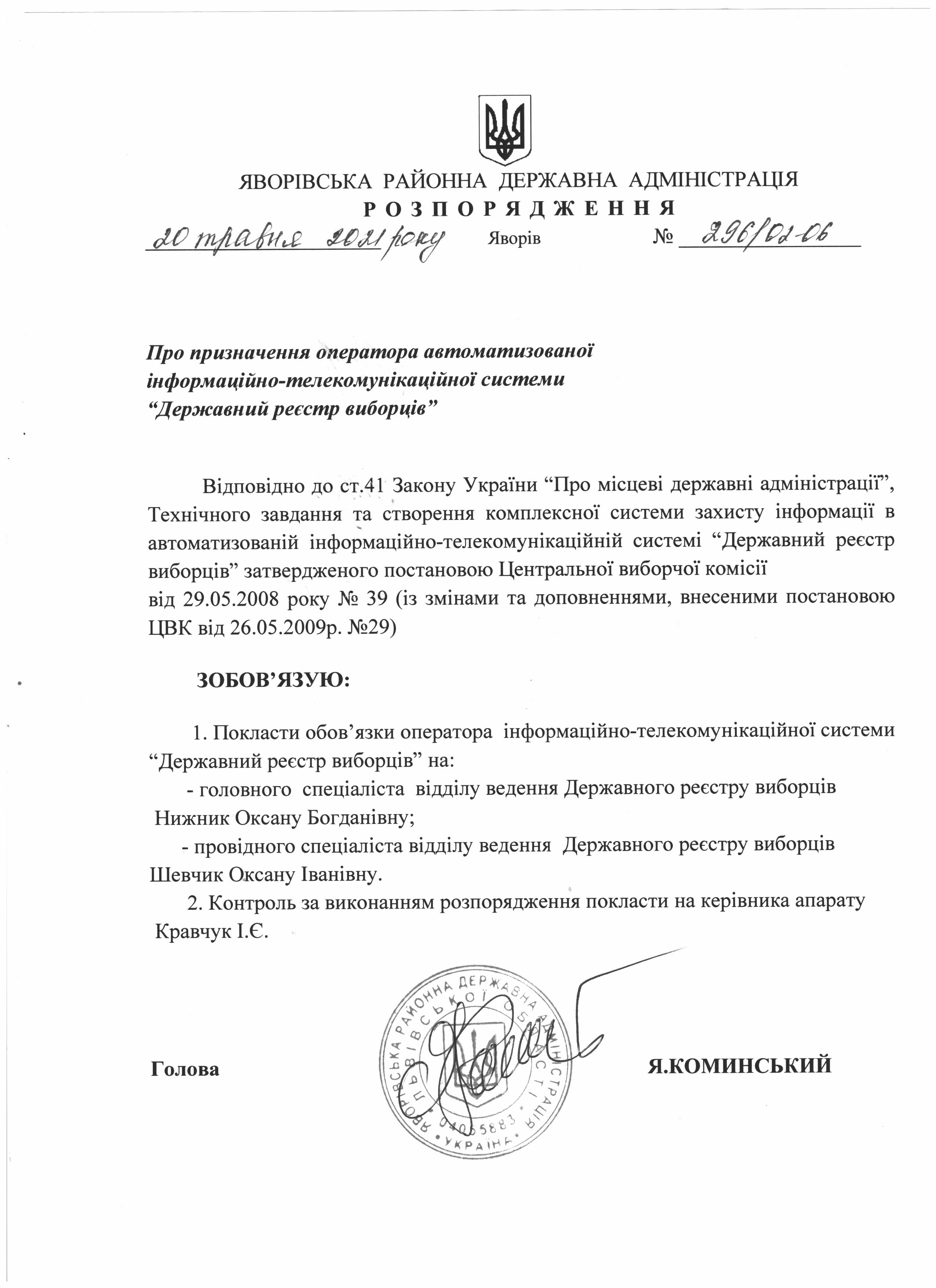 296/02-06 2021-05-20 Про призначення оператора автоматизованої інформаційно-телекомунікаційної системи "Державний реєстр виборців"