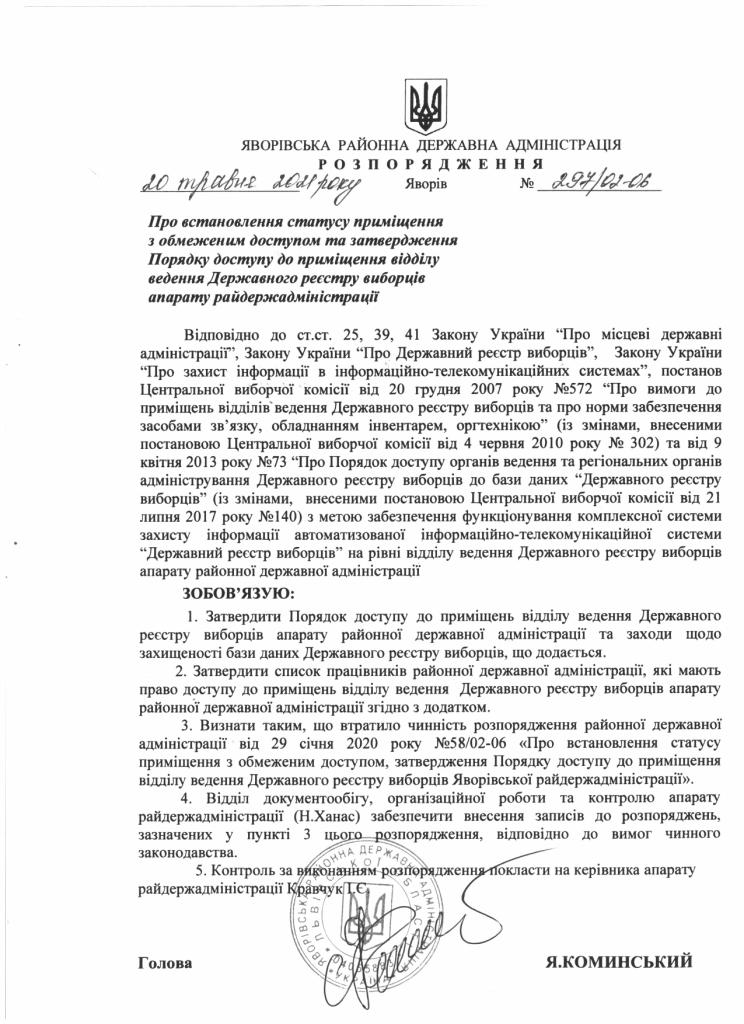 297/02-06 2021-05-20 Про встановлення статусу приміщення з обмеженим доступом та затвердження Порядку доступу до приміщення відділу ведення Державного реєстру виборців апарату райдержадміністрації