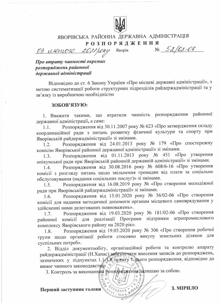 52/02-06 2021-02-03 Про втрату чинності окремих розпоряджень районної державної адміністрації