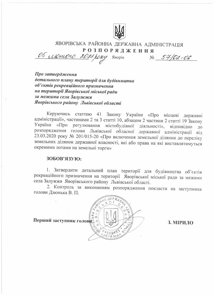 57/02-06 2021-02-05 Про затвердження детального плану території для будівництва об'єктів рекреаційного призначення на території Яворівської міської ради за межами села Залужжя Яворівського району Львівської області