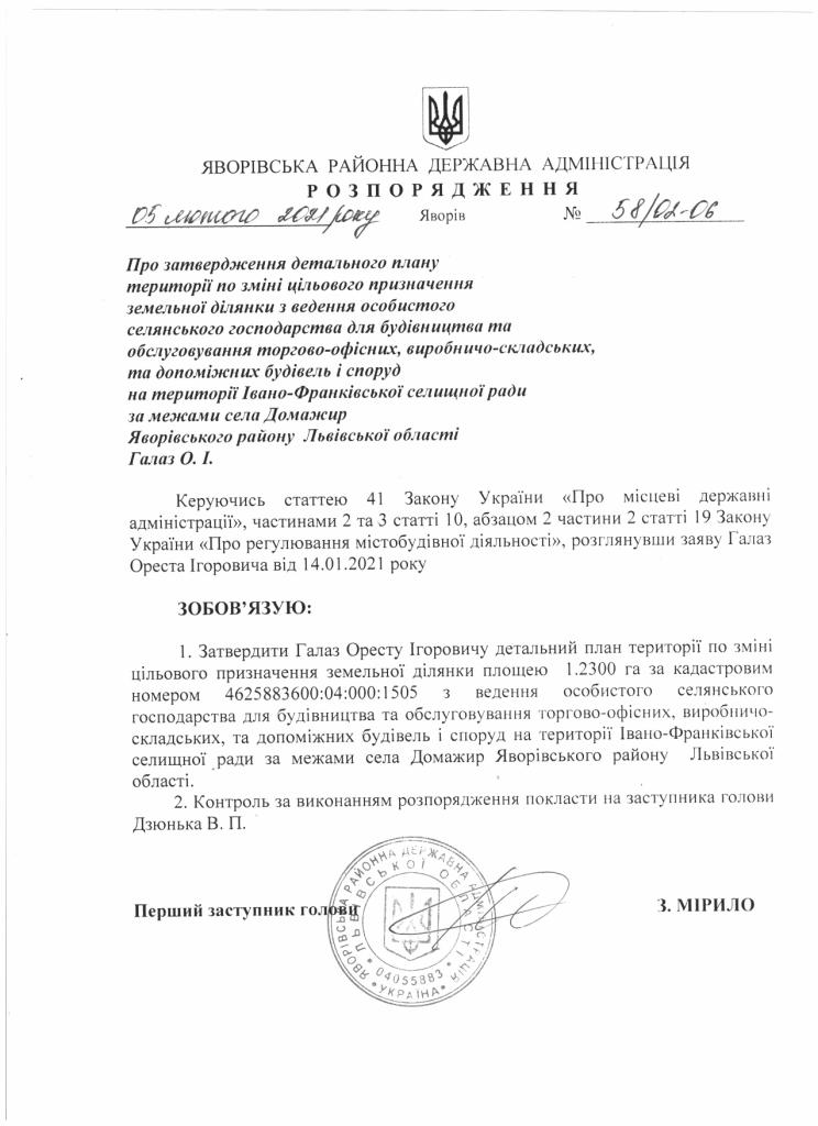 58/02-06 2021-02-05 Про затвердження детального плану території по зміні цільового призначення земельної ділянки з ведення особистого селянського господарства для будівництва та обслуговування торгово-складських та допоміжних будівель і споруд на території Івано-Франківської селищної ради за межами села Домажир Яворівського району Львівської області Галаз О.І.