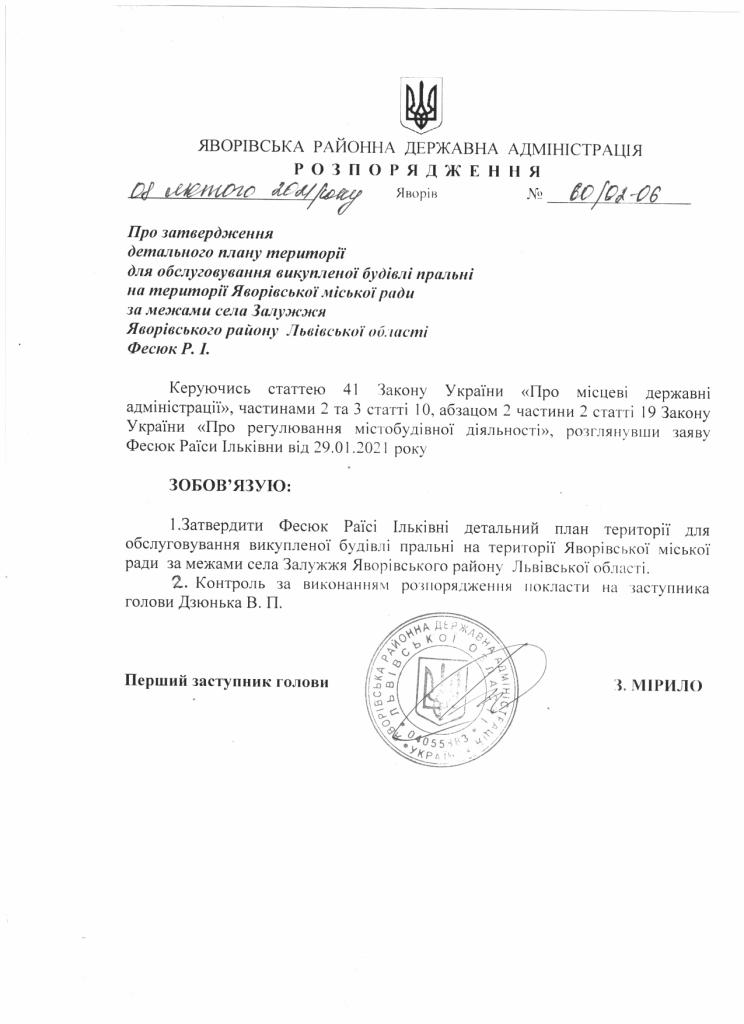 60/02-06 2021-02-08 Про затвердження детального плану території для обслуговування викупленої будівлі пральні на території Яворівської міської ради за межами села Залужжя Яворівського району Львівської області Фесюк Р.І.