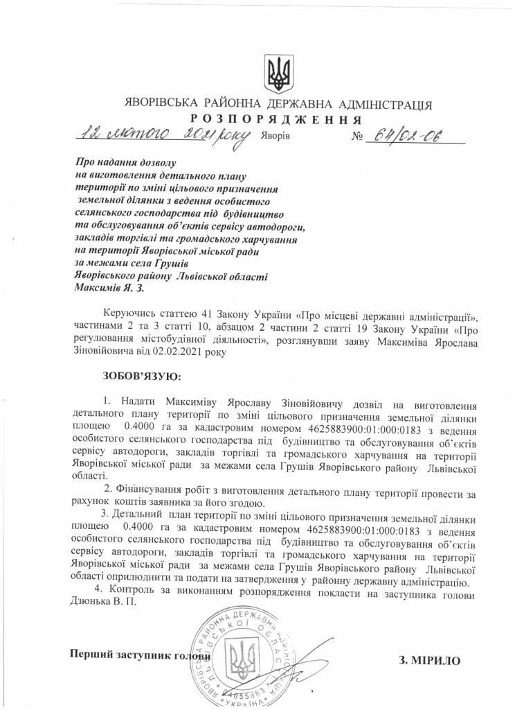 64/02-06 2021-02-12 Про надання дозволу на виготовлення детального плану території по зміні цільового призначення земельної ділянки з ведення особистого селянського господарства під будівництво та обслуговування об'єктів сервісу автодороги, закладів торгівлі та громадського харчування на території Яворівської міської ради за межами села Грушів Яворівського району Львівської області