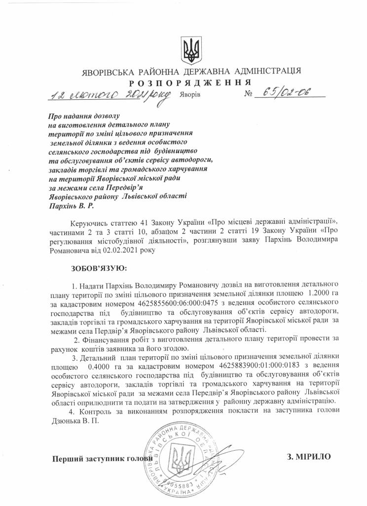 65/02-06 2021-02-12 Про надання дозволу на виготовлення детального плану території по зміні цільового призначення земельної ділянки з ведення особистого селянського господарства під будівництво та обслуговування об'єктів сервісу автодороги, закладів торгівлі та громадського харчування на території Яворівської міської ради за межами села Передвір'я Яворівського району Львівської області Пархінь В.Р.