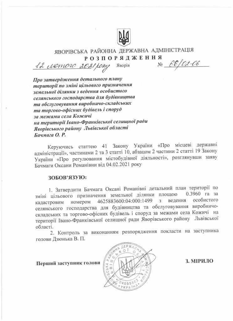 66/02-06 2021-02-12 Про затвердження детального плану території по зміні цільового призначення земельної ділянки з ведення особистого селянського господарства для будівництва та обслуговування виробничо-складських та торгово-офісних будівель і споруд за межами села Кожичі на території Івано-Франківської селищної ради Яворівського району Львівської області Бачмага О.Р.