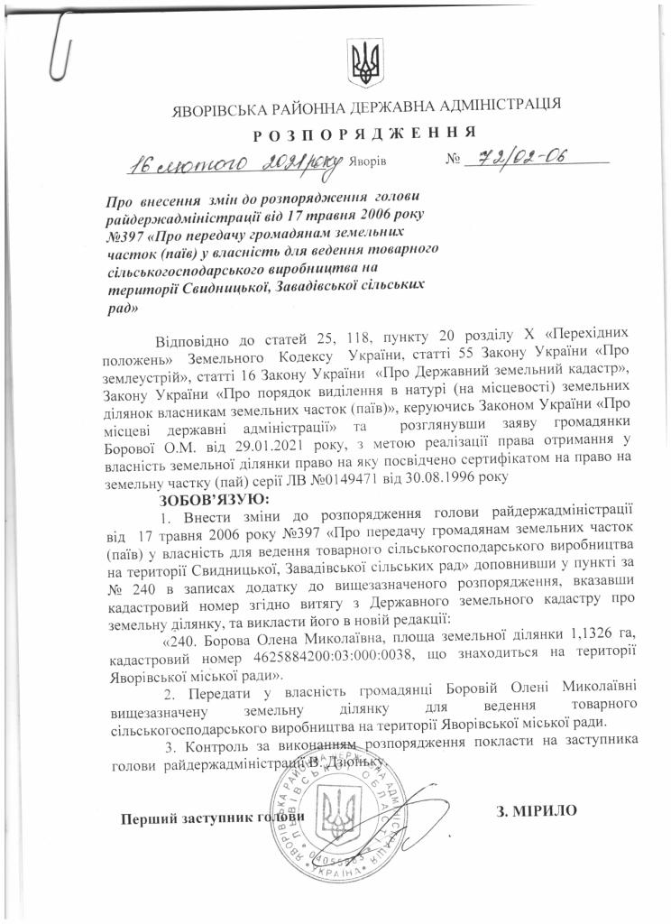 72/02-06 2021-02-16 Про внесення змін до розпорядження голови райдержадміністрації від 17 травня 2006 року №397 "Про передачу громадянам земельних часток (паїв) у власність для ведення товарного сільськогосподарського виробництва на території Свидницької, Завадівської сільських рад"