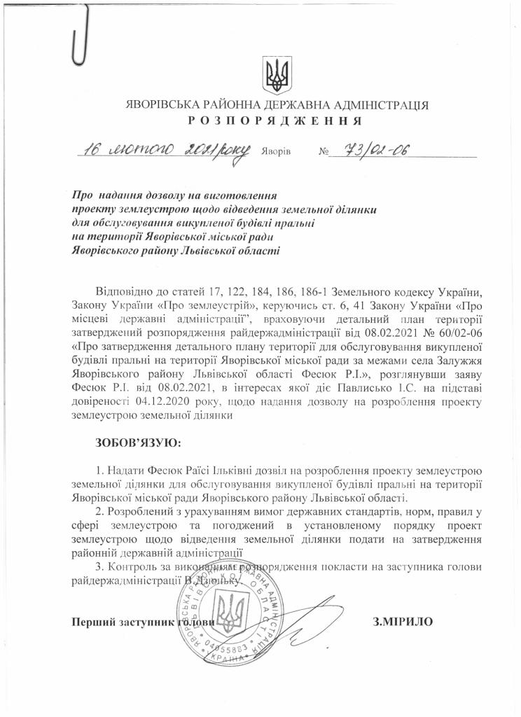 73/02-06 2021-02-16 Про надання дозволу на виготовлення проекту землеустрою щодо відведення земельної ділянки для обслуговування викупленої будівлі пральні на території Яворівської міської ради Яворівського району Львівської області