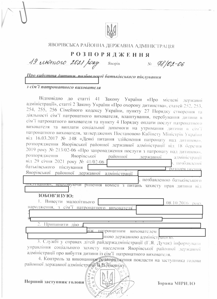 78/02-06 2021-02-19 Про вибуття дитини, позбавленої батьківського піклування з сім'ї патронатного виховання