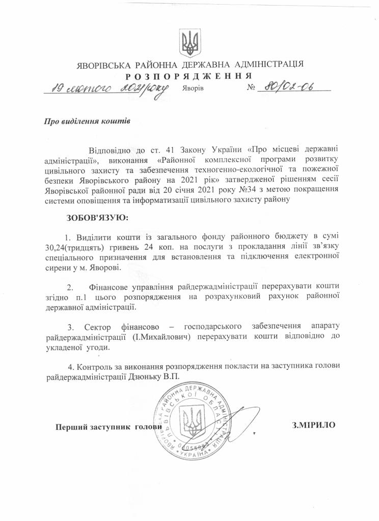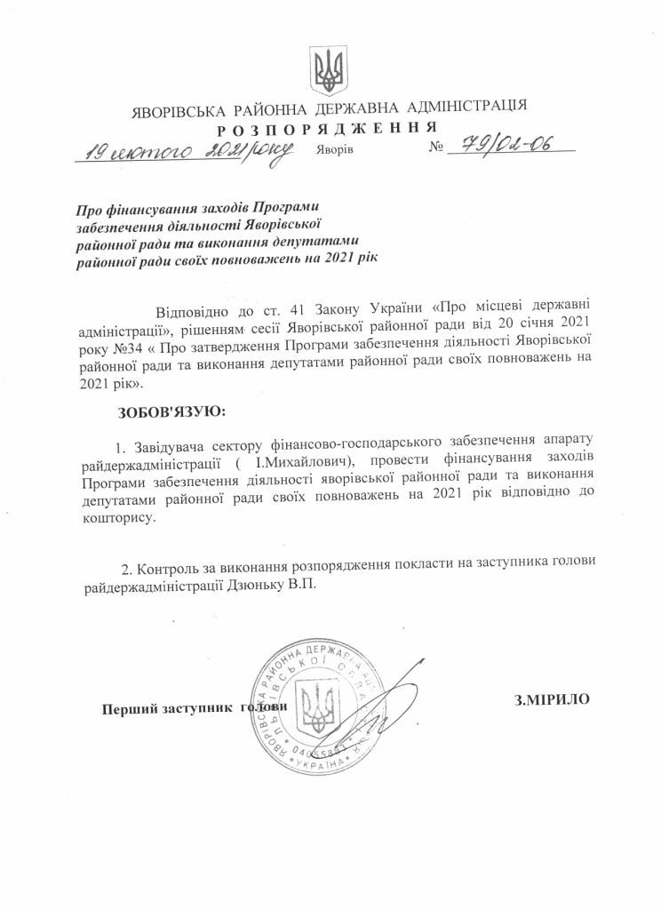79/02-06 2021-02-19 Про фінансування заходів Програми забезпечення діяльності Яворівської ради та виконання депутатами районної ради своїх повноважень на 2021 рік
