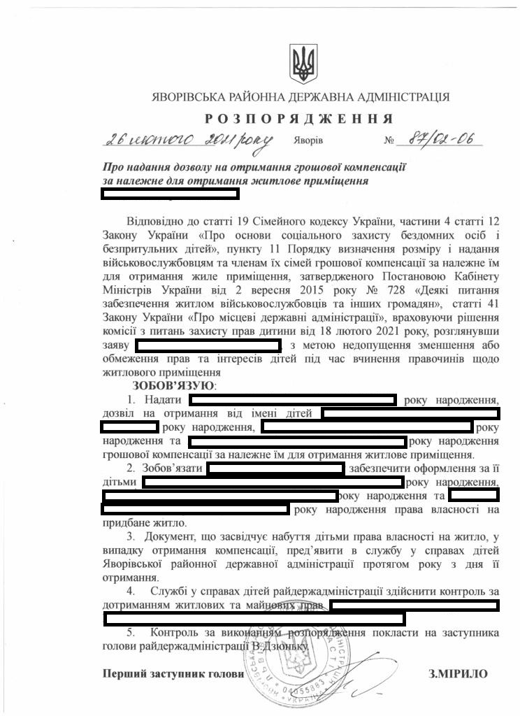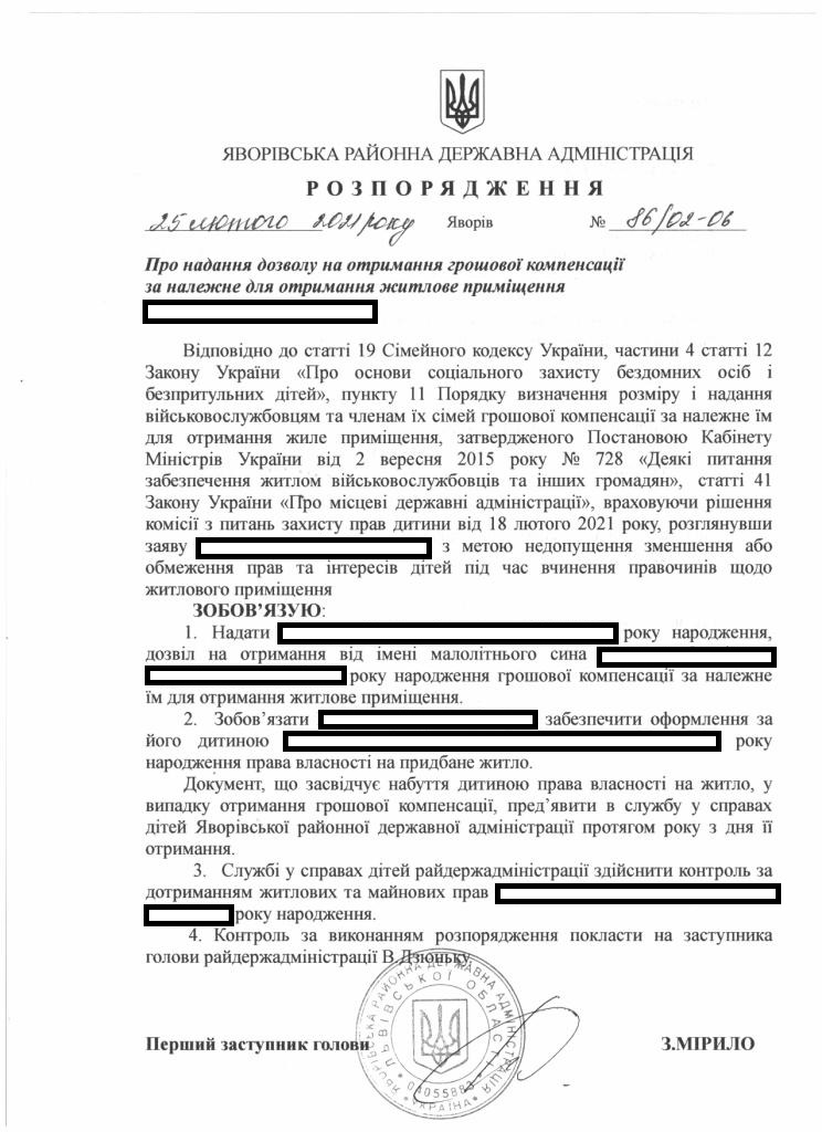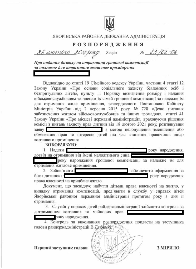 86/02-06 2021-02-25 Про надання дозволу на отримання грошової компенсації за належне для отримання житлове приміщення