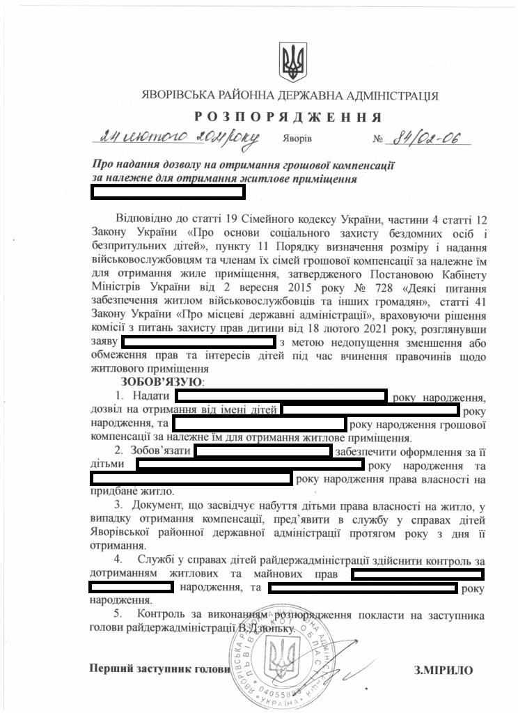 84/02-06 2021-02-24 Про надання дозволу на отримання грошової компенсації за належне для отримання житлове приміщення