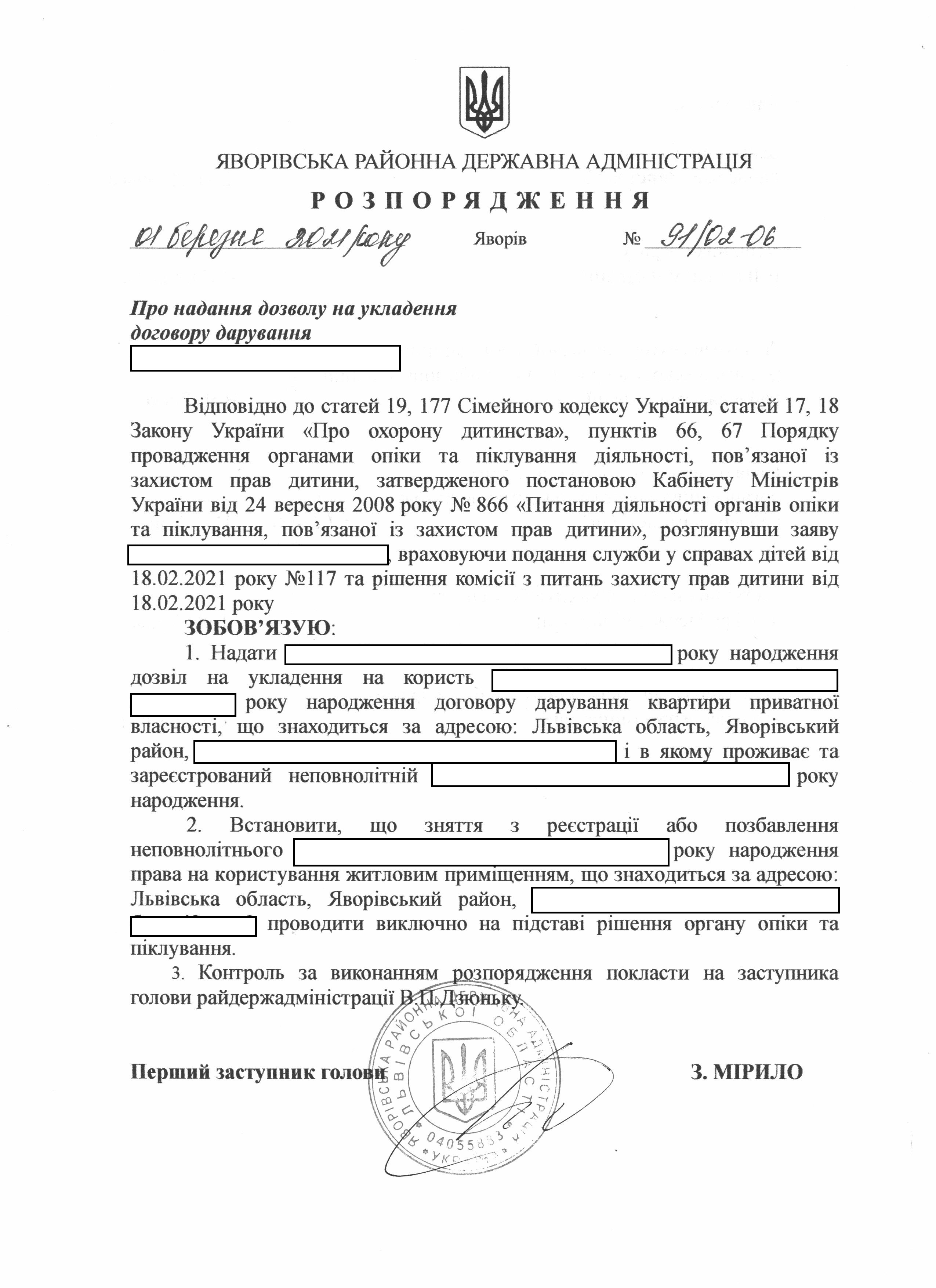 91/02-06 2021-03-01 Про надання дозволу на укладення договору дарування
