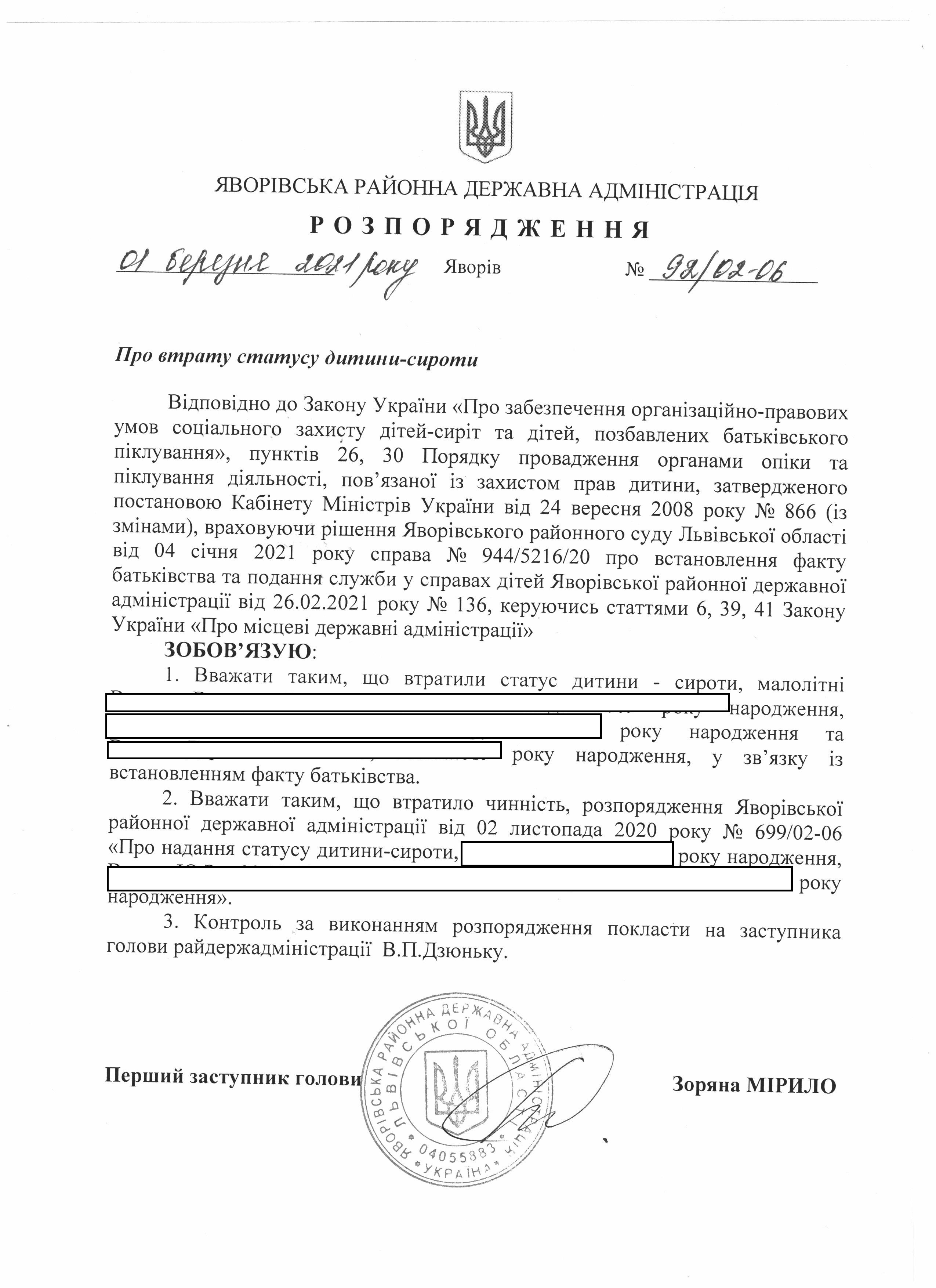 92/02-06 2021-03-01 Про втрату статусу дитини-сироти